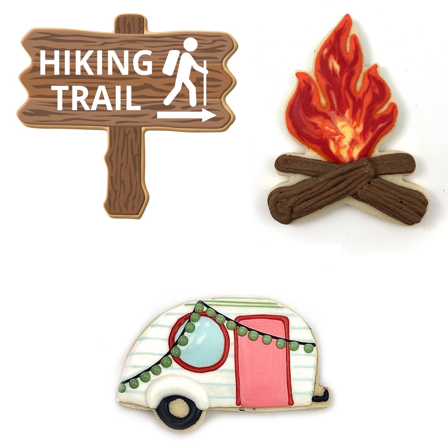 CookieCutter.com 3 Piece Summer Fall Camping Cookie Cutter Set Camper Glamper, Wooden Sign, Campfire, Metal Shapes Made in USA, Silver