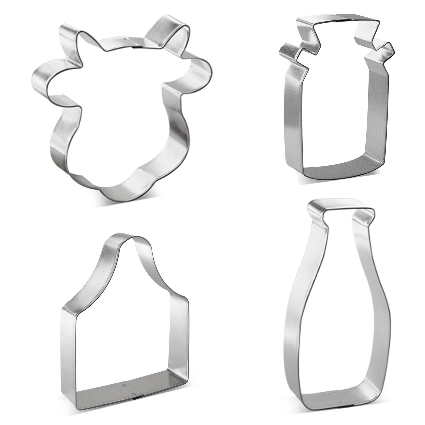 CookieCutter.com Dairy Farm Cow 4 Piece Cookie Cutters Set, Cow Face, Milk Bottle, Ear Tag, Milk Jug, Tin Plate Steel, USA
