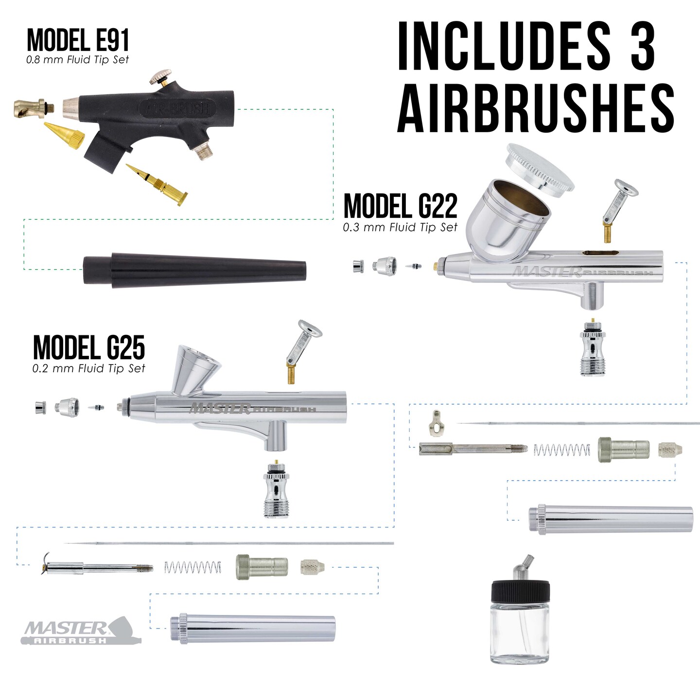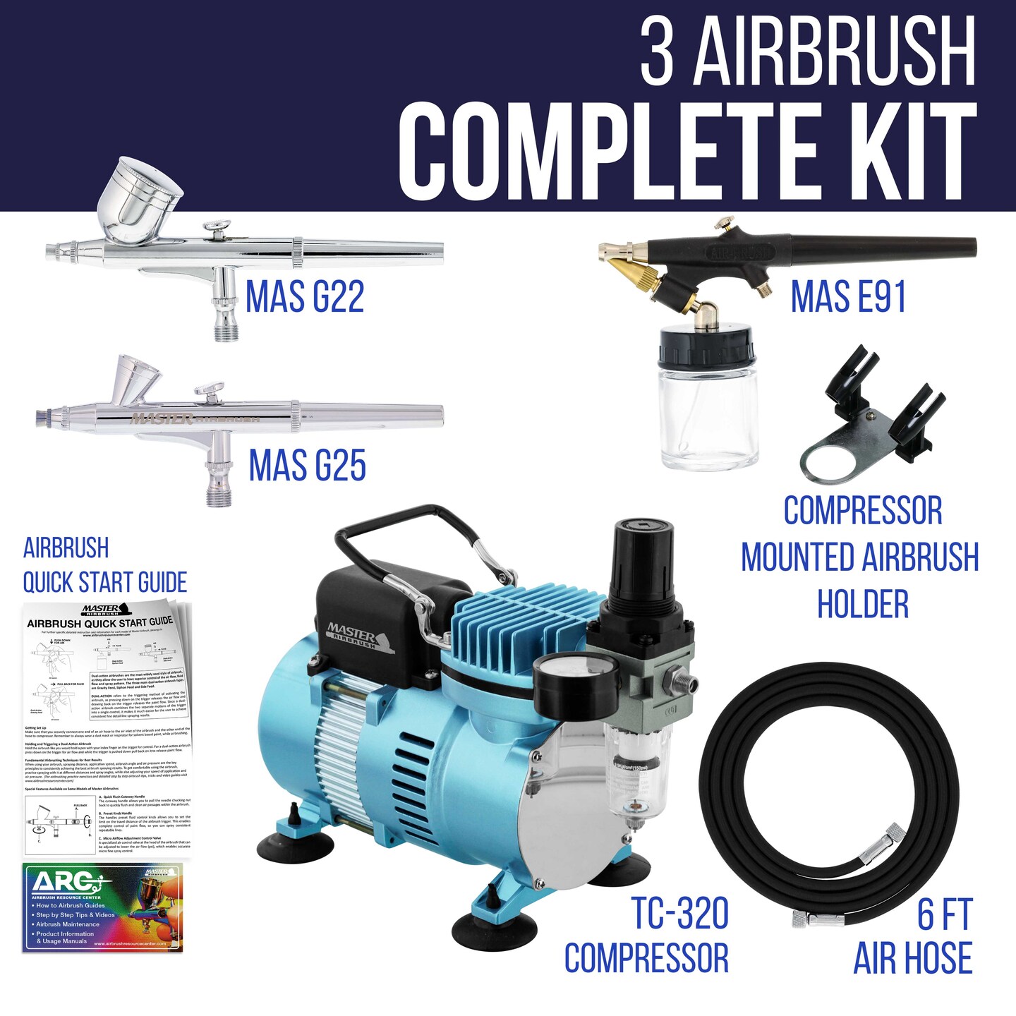 Cool Runner II Dual Fan Air Compressor Airbrushing System Kit with 3 Airbrush Sets 0.2, 0.3mm Gravity & 0.8mm Siphon Feed - Hose, Holder, How-To Guide