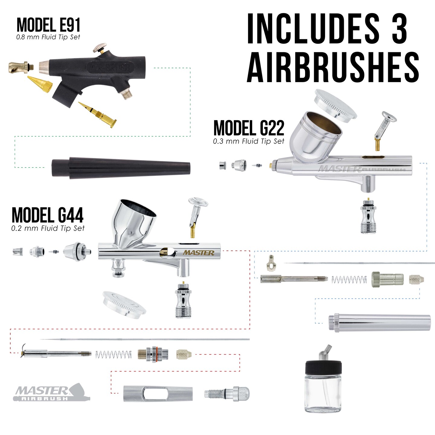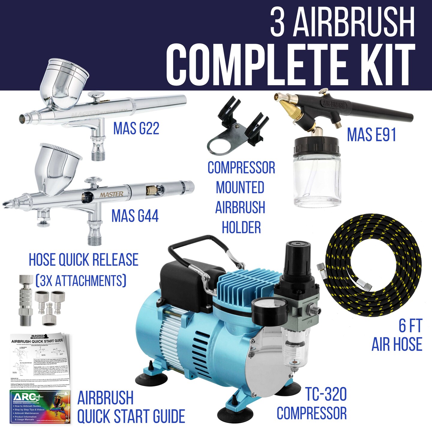 Cool Runner II Dual Fan Air Compressor Fine Detail Control System with 3 Airbrushes, 0.2, 0.3mm Gravity and Siphon Feed - Hose, How-To Guide