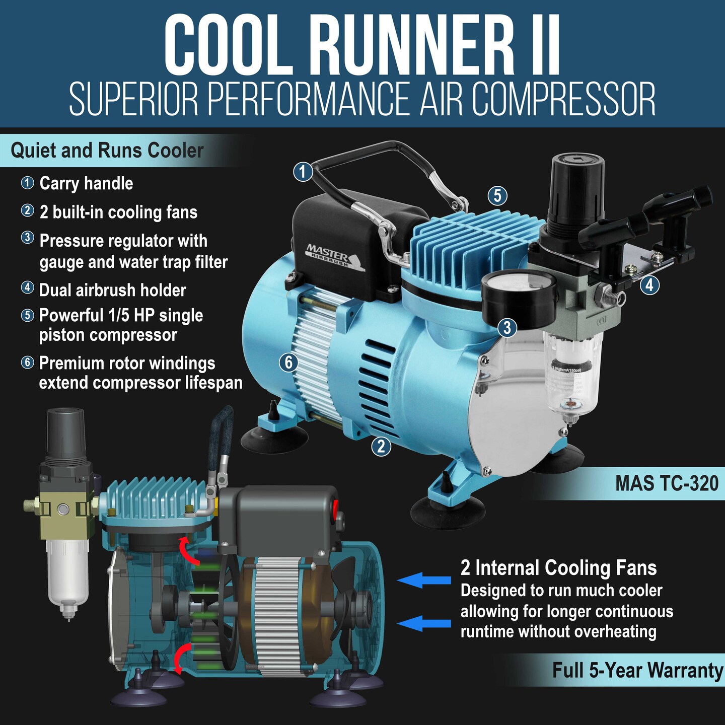 Cool Runner II Dual Fan Air Compressor System Kit with Master Elite Plus Ultimate Airbrush Set with 3 Tips 0.2, 0.3 & 0.5 mm, Case, Dual-Action, 2 Cups