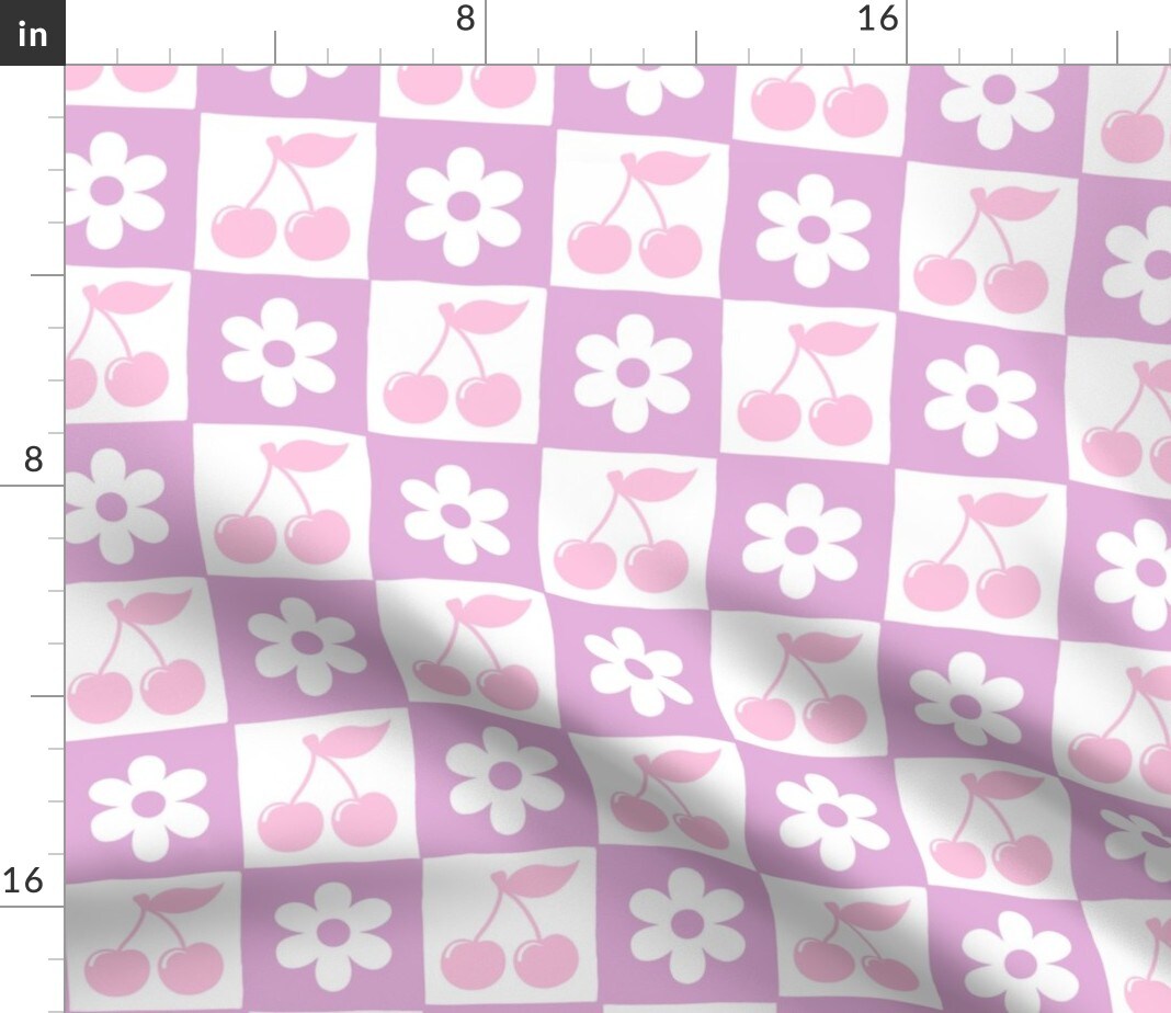 Coquette Retro Vintage Y2K Pink And Purple Cherry Daisy Checkered Custom Printed Fabric by Spoonflower Various Fabrics by the Yard or Fat Quarter