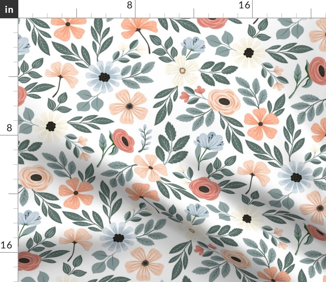 Coral Floral Sage Green Leaf Pretty Flowers Delicate Garden Custom Printed Fabric by Spoonflower Various Fabrics by the Yard or Fat Quarter