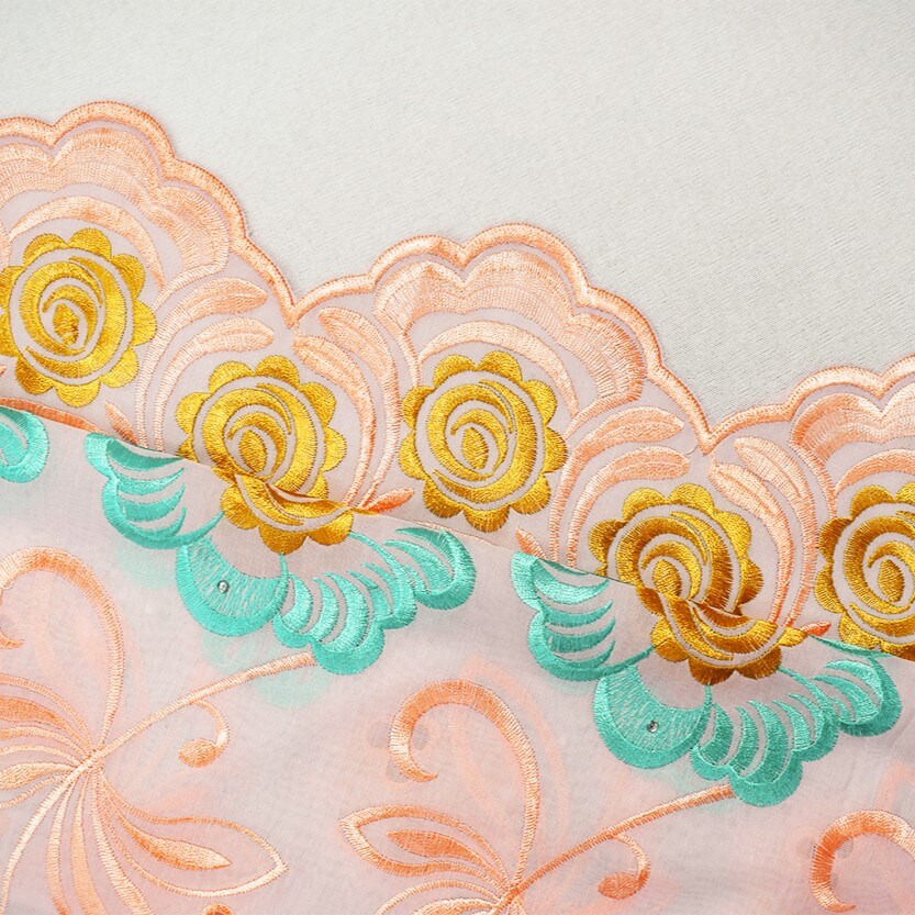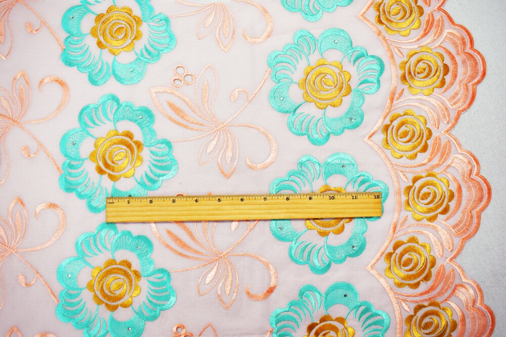 Coral Orange-Teal-Multi Poly-Cotton Floral Embroidered Scallop Eyelet Woven Fabric By the Yard