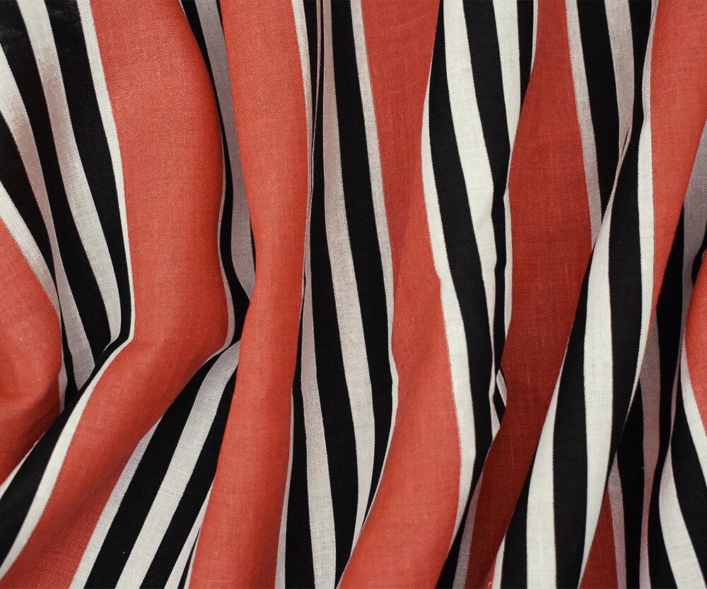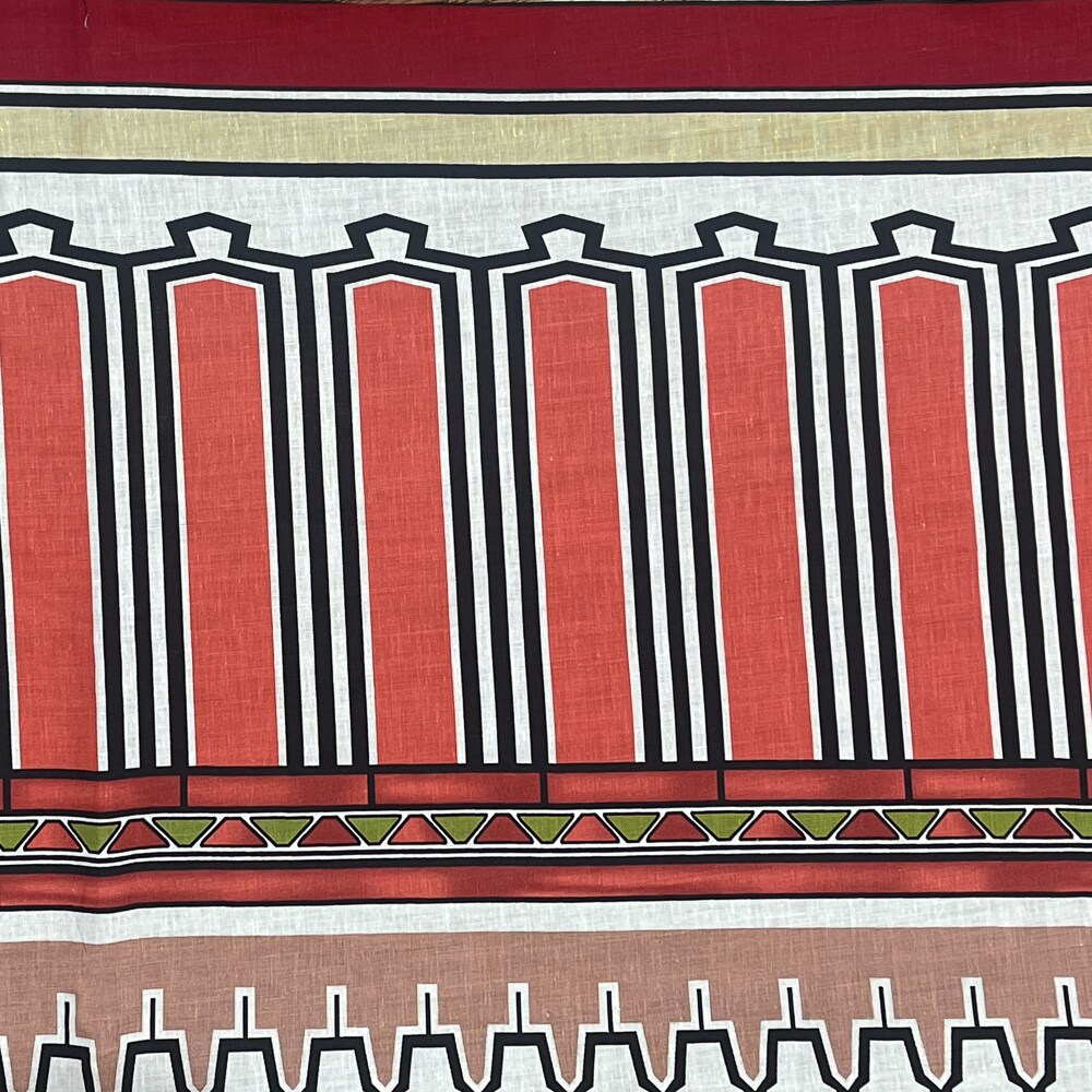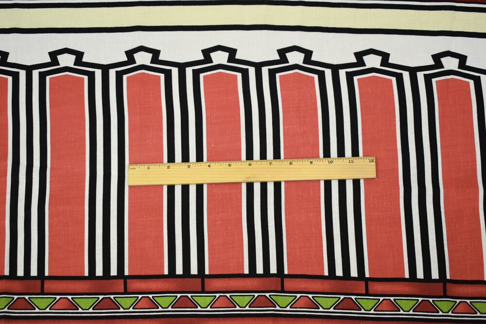 Coral Red-Black-Multi Aztec Pattern Printed Linen Woven Fabric By the Yard