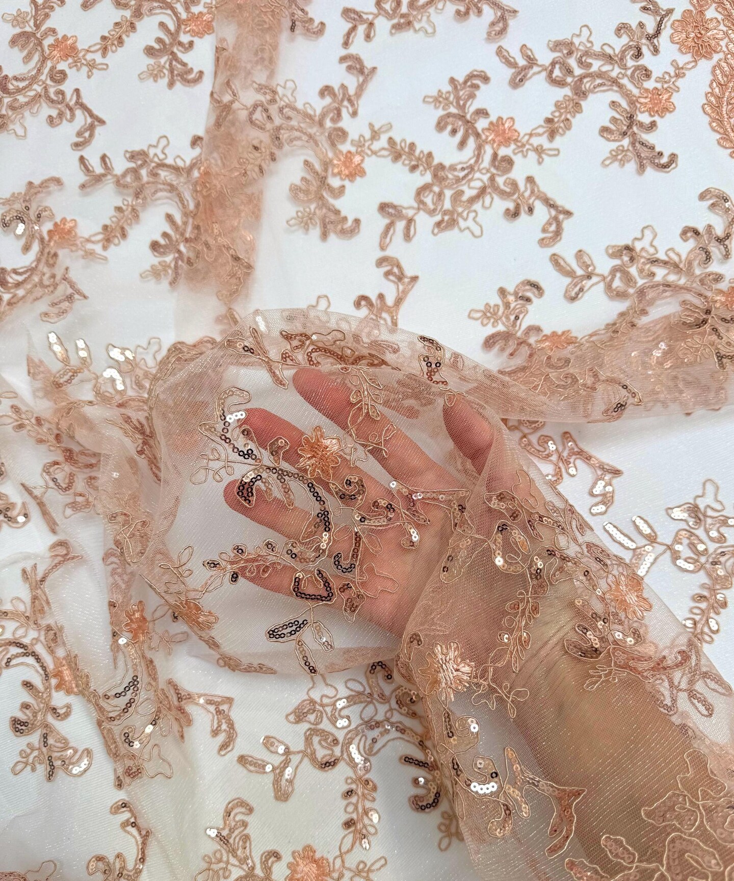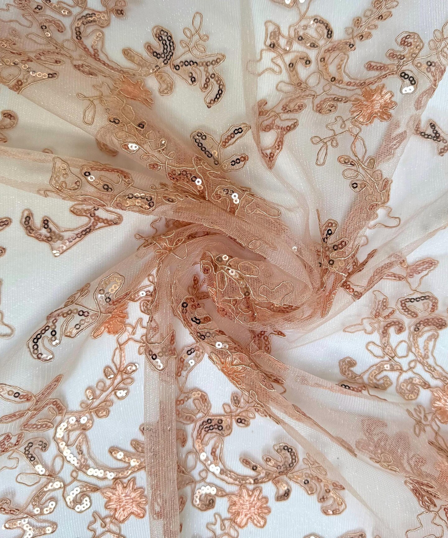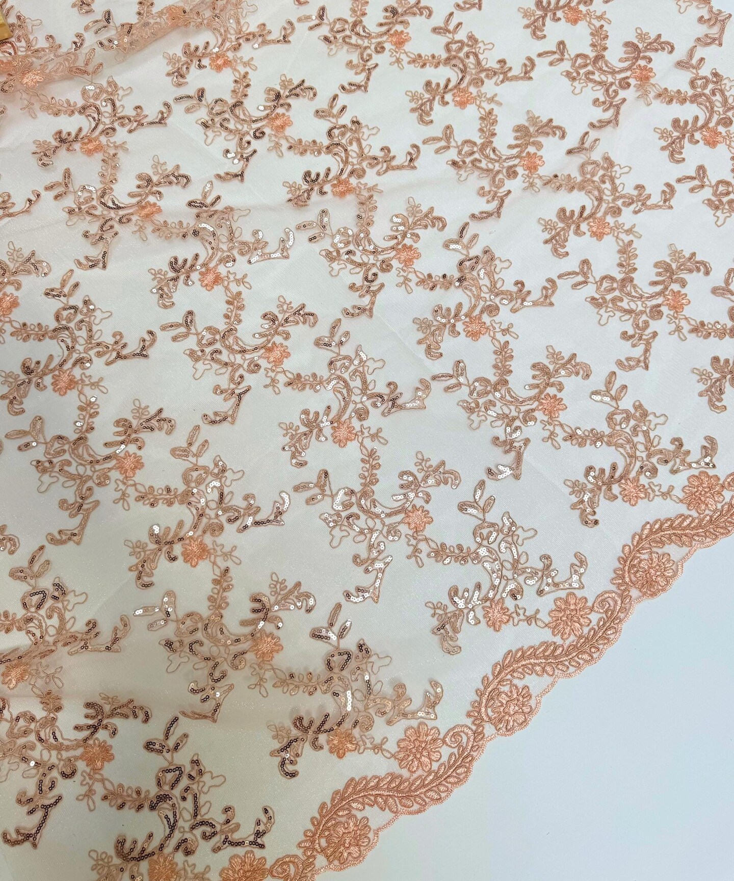 Coral Sequin Embroidered Lace Fabric by the Yard, 54" Wide Floral Mesh Lace with Double Scalloped Edges