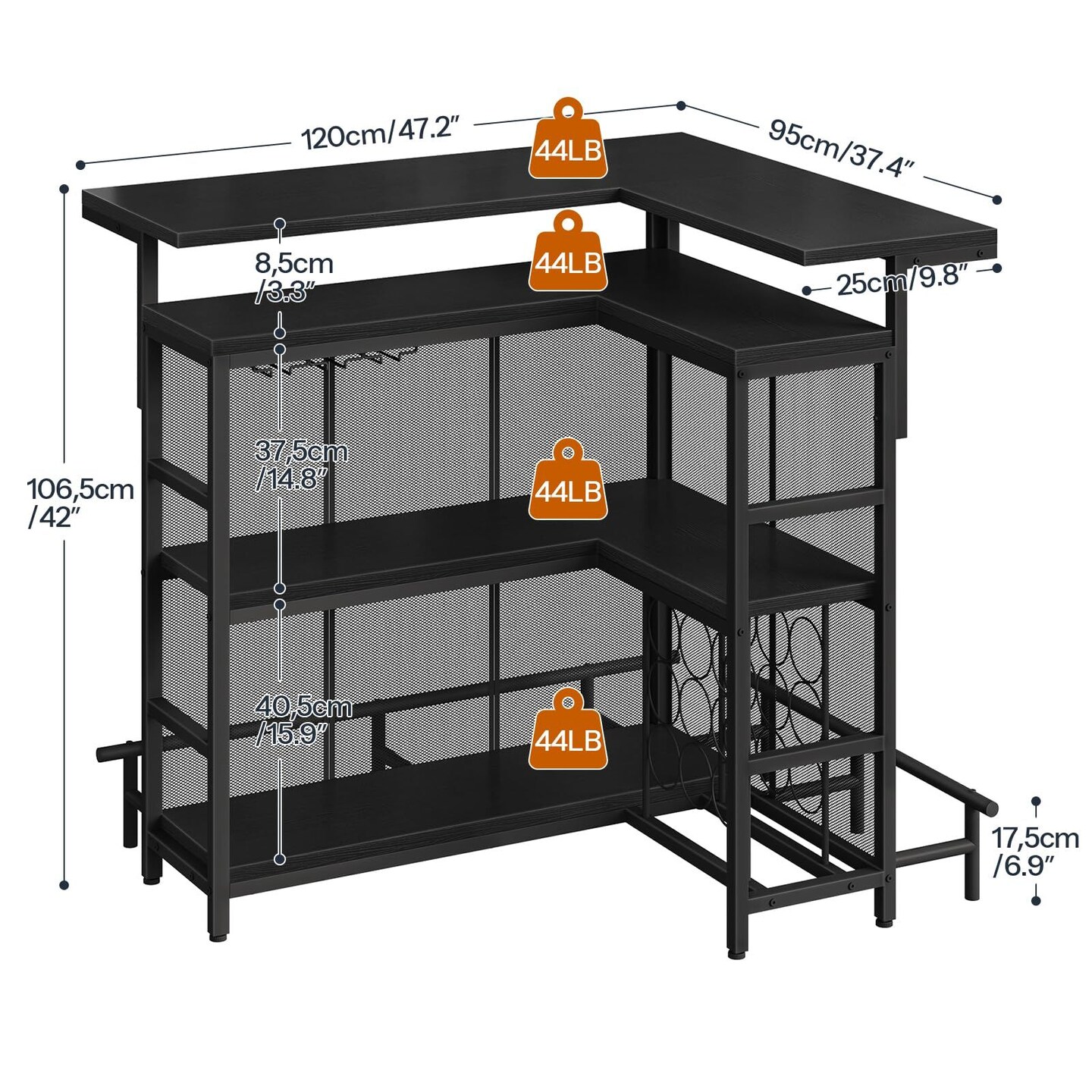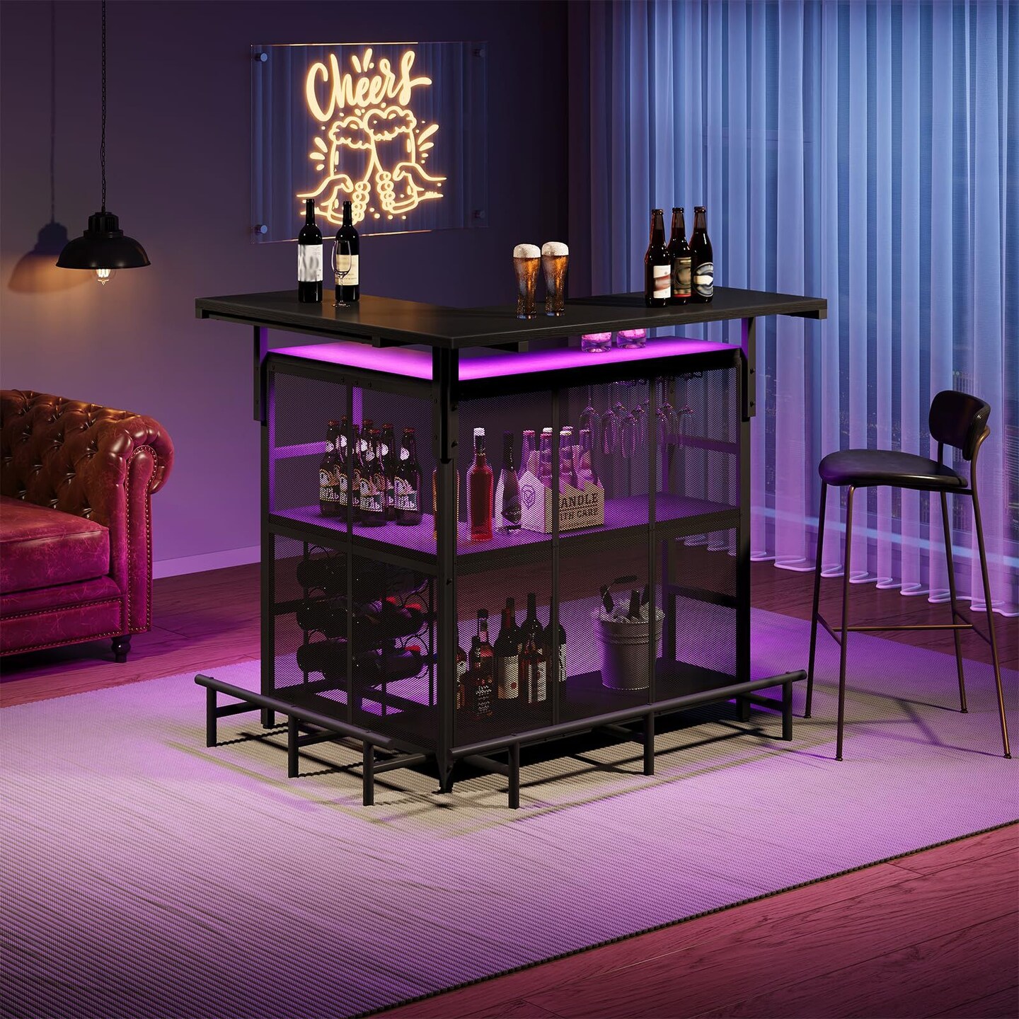 Corner Bar Cabinet with LED Light Strip, Wine Storage and Glass Racks