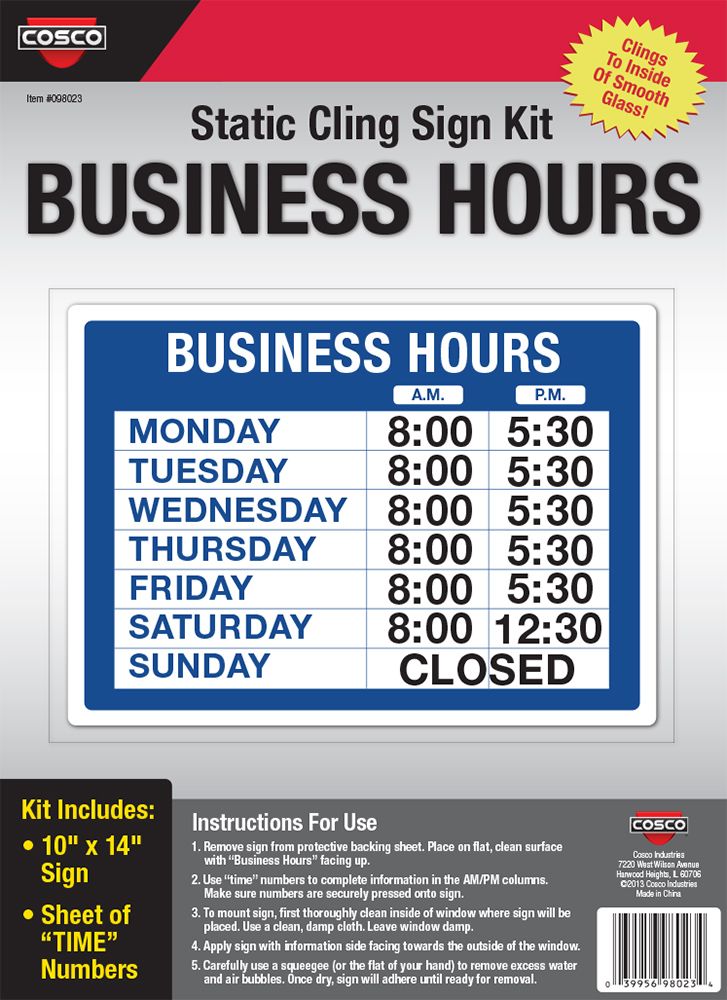 COSCO Business Hours Static Cling Sign Kit, 10" x 14", Time Numbers Included, For Window Use, Blue and White Sign