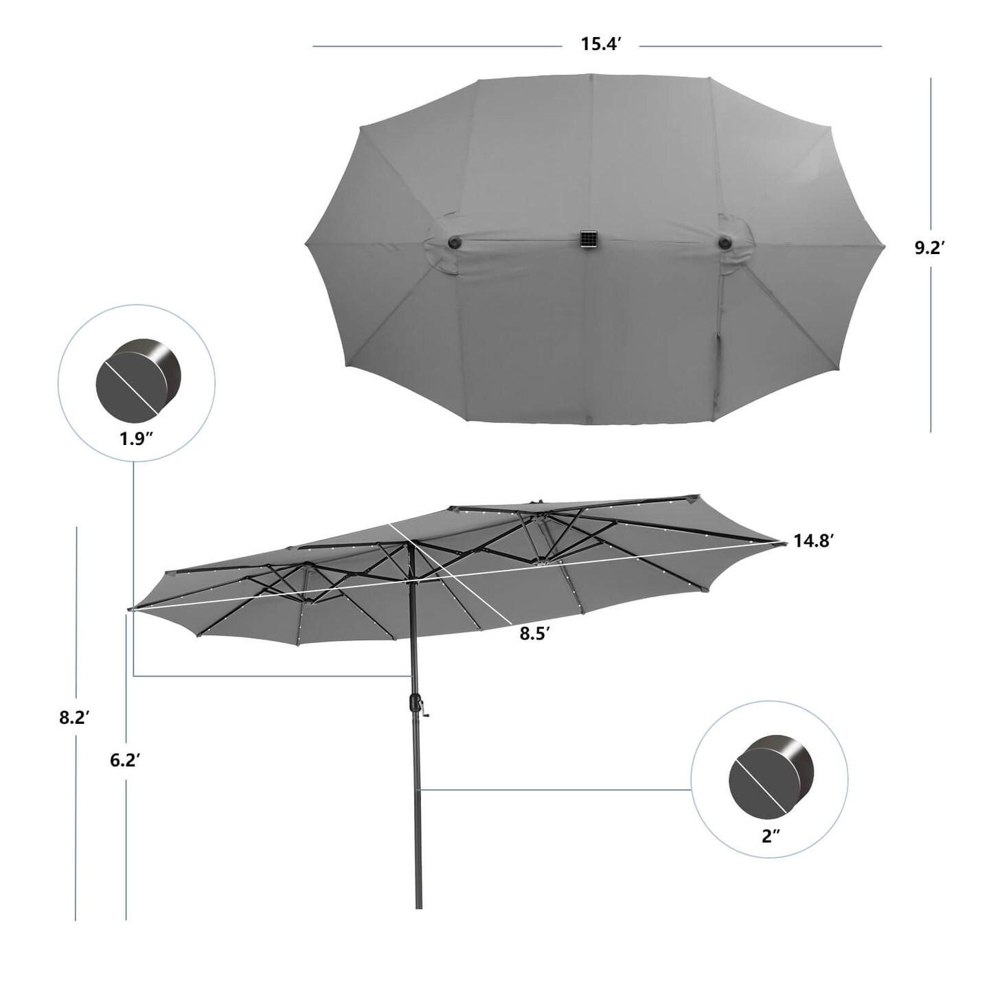 Costway 15 FT Twin Patio Double-Sided Umbrella 48 Solar LED Lights Crank Outdoor Gray