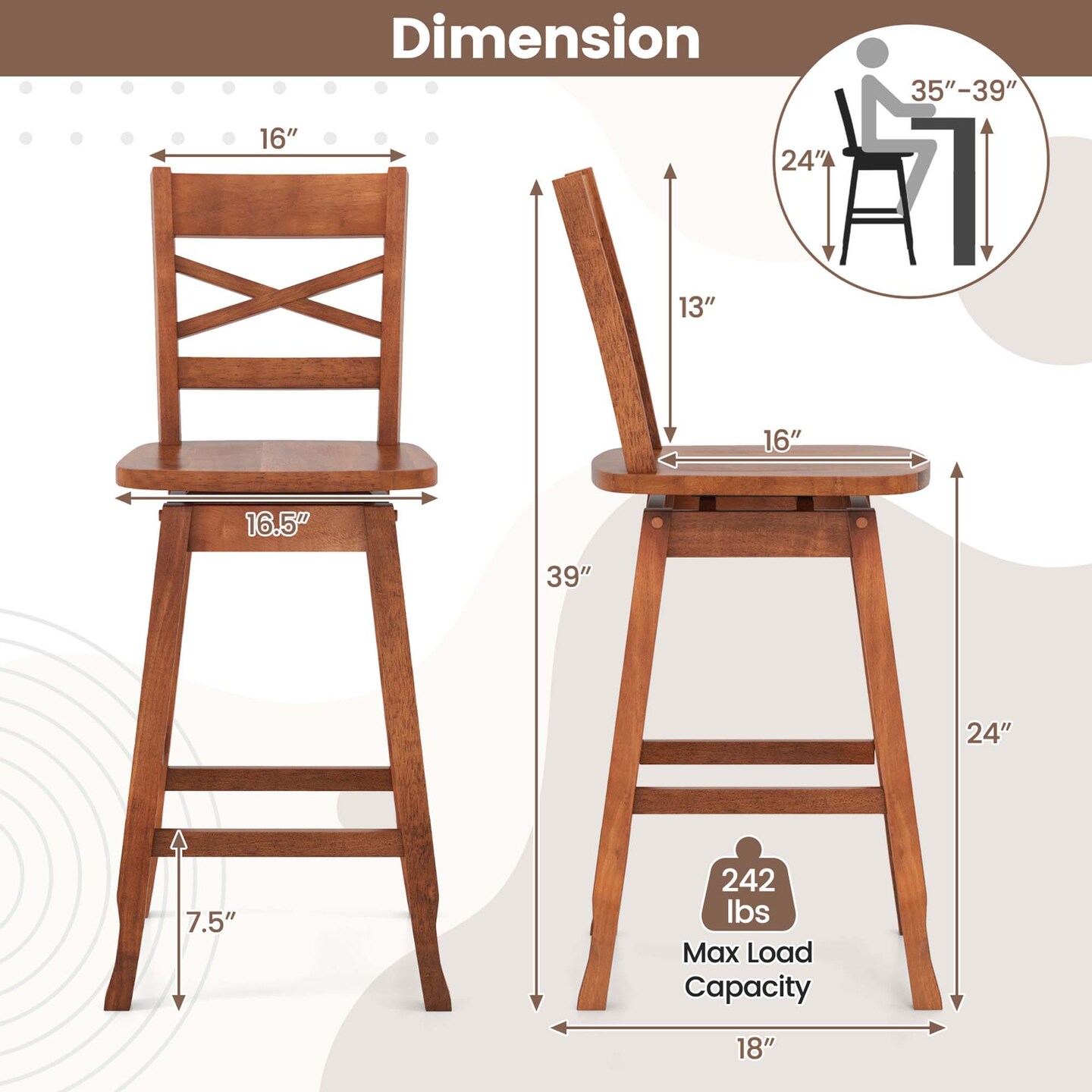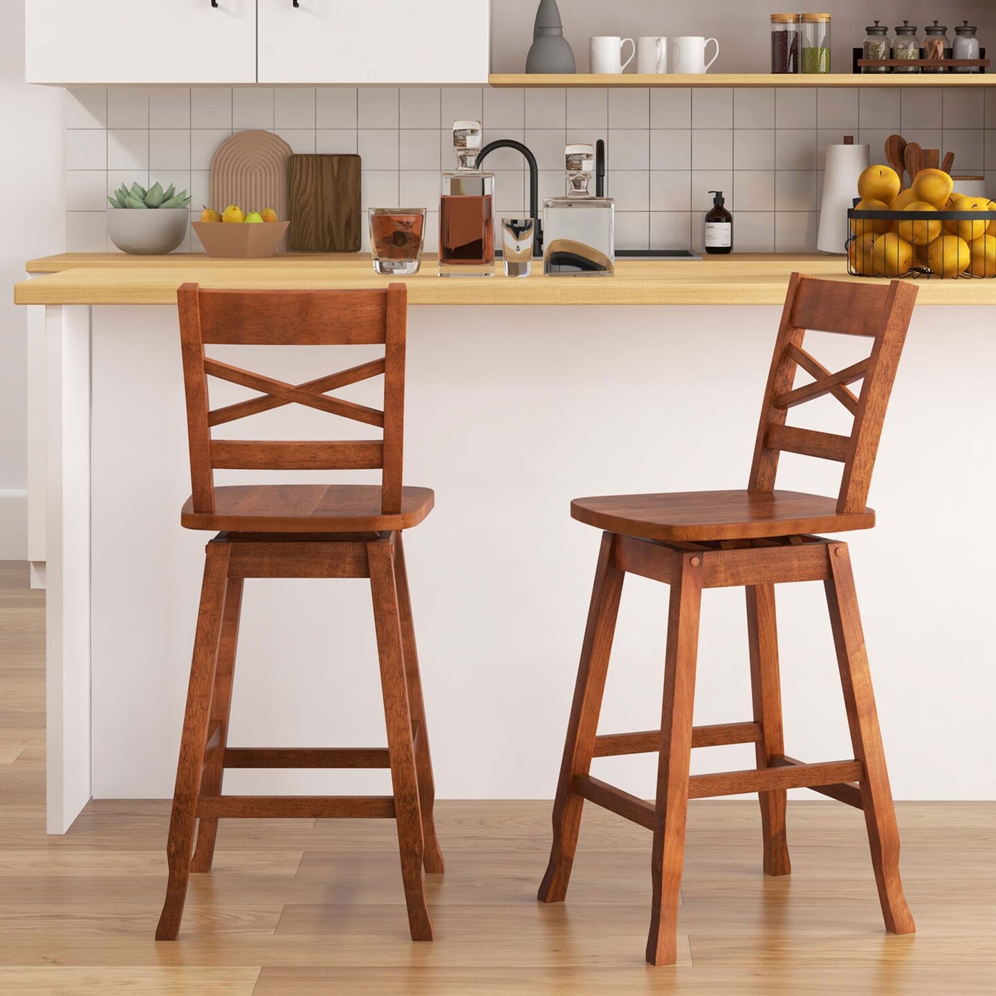 Costway 2 PCS 24"/30" Counter/Bar Height Stool Rubber Wood Swivel Bar Stool with Inclined Backrest Walnut