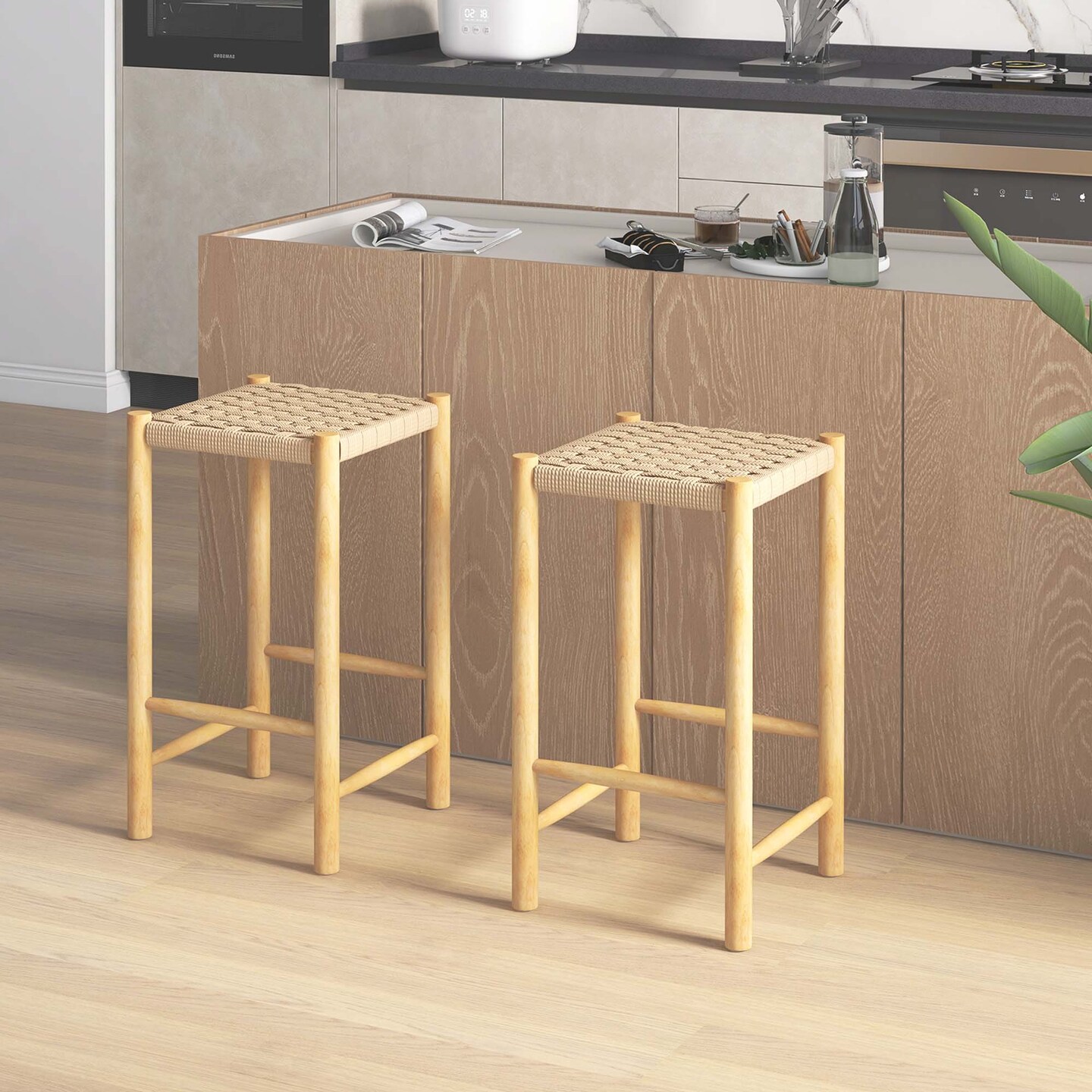 Costway 26'' Dining Bar Stool Set of 2/4 Counter Height with Rubber Wood Woven Saddle Seat