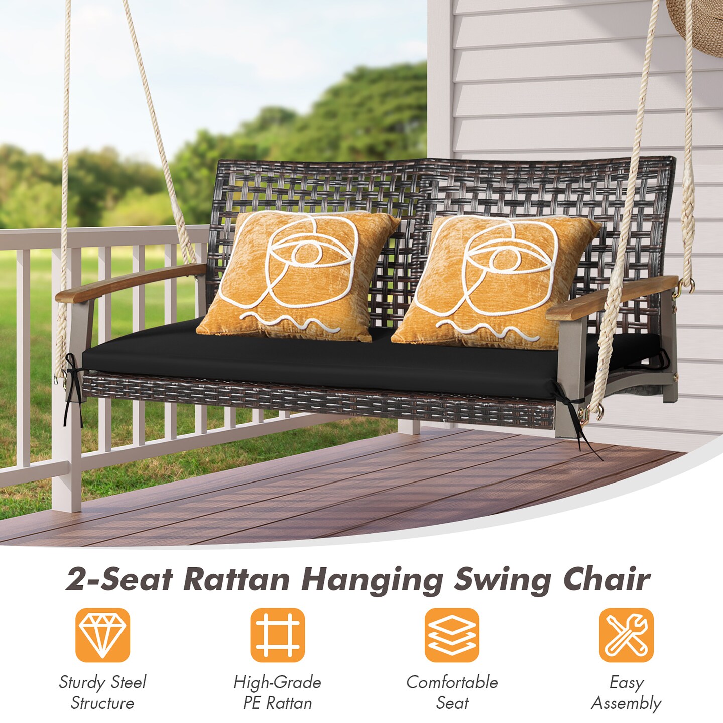 Costway 2-Person Patio Rattan Hanging Swing Chair Porch Loveseat Cushion Off