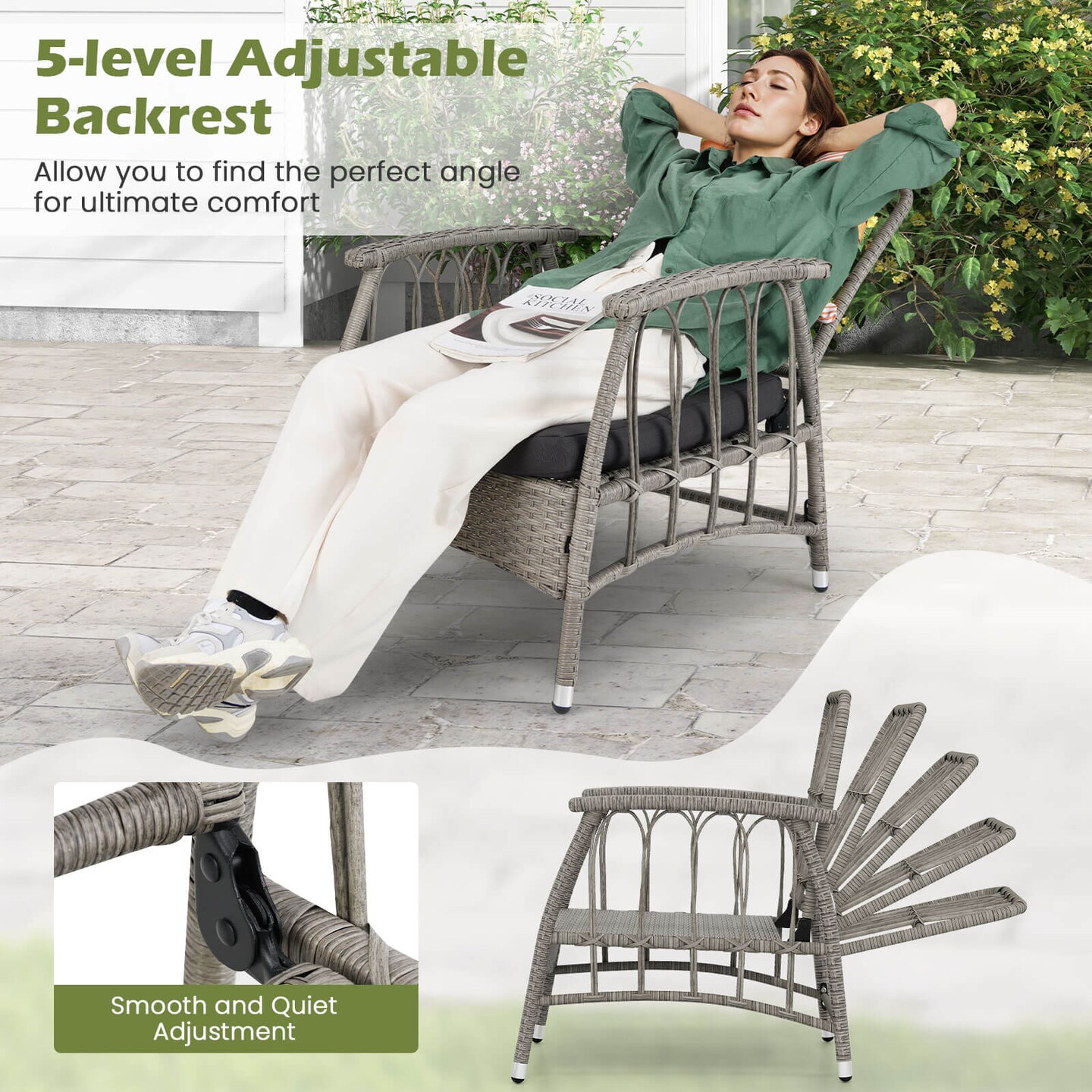 Costway 3 PCS Patio PE Wicker Furniture Set with 5-Level Adjustable Backrest Bistro Set