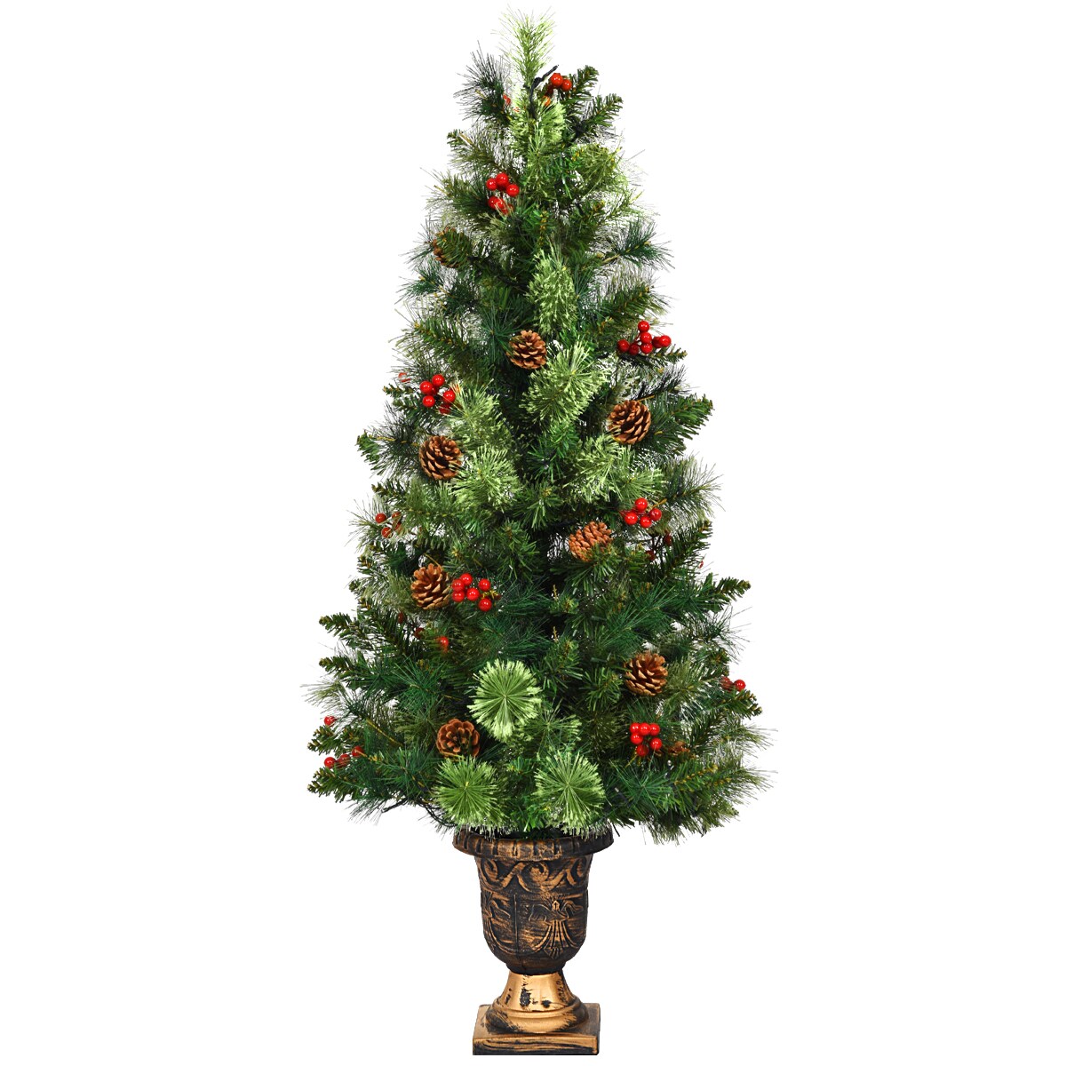 Costway 3/4/5 ft Pre-Lit Christmas Entrance Tree In Urn with 40/60/100 LED Light Red Berries Pine Cone