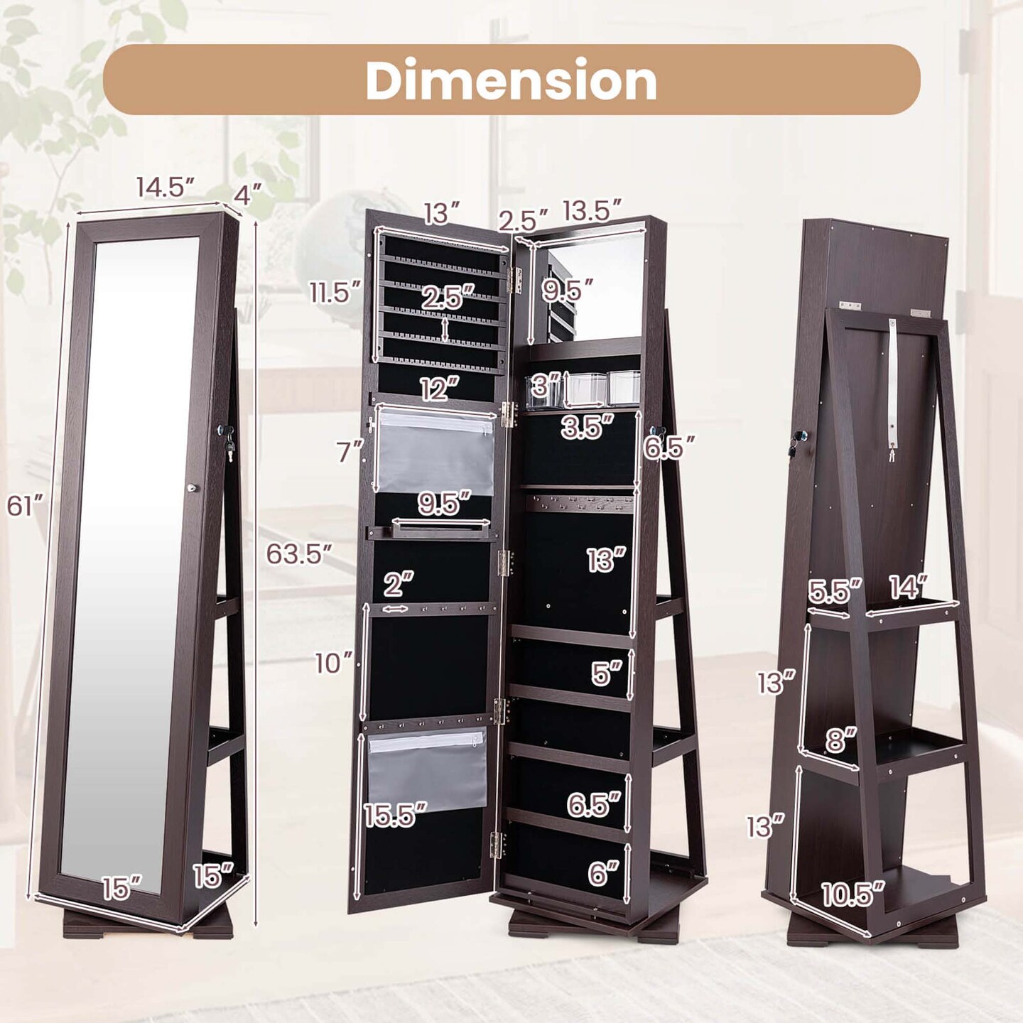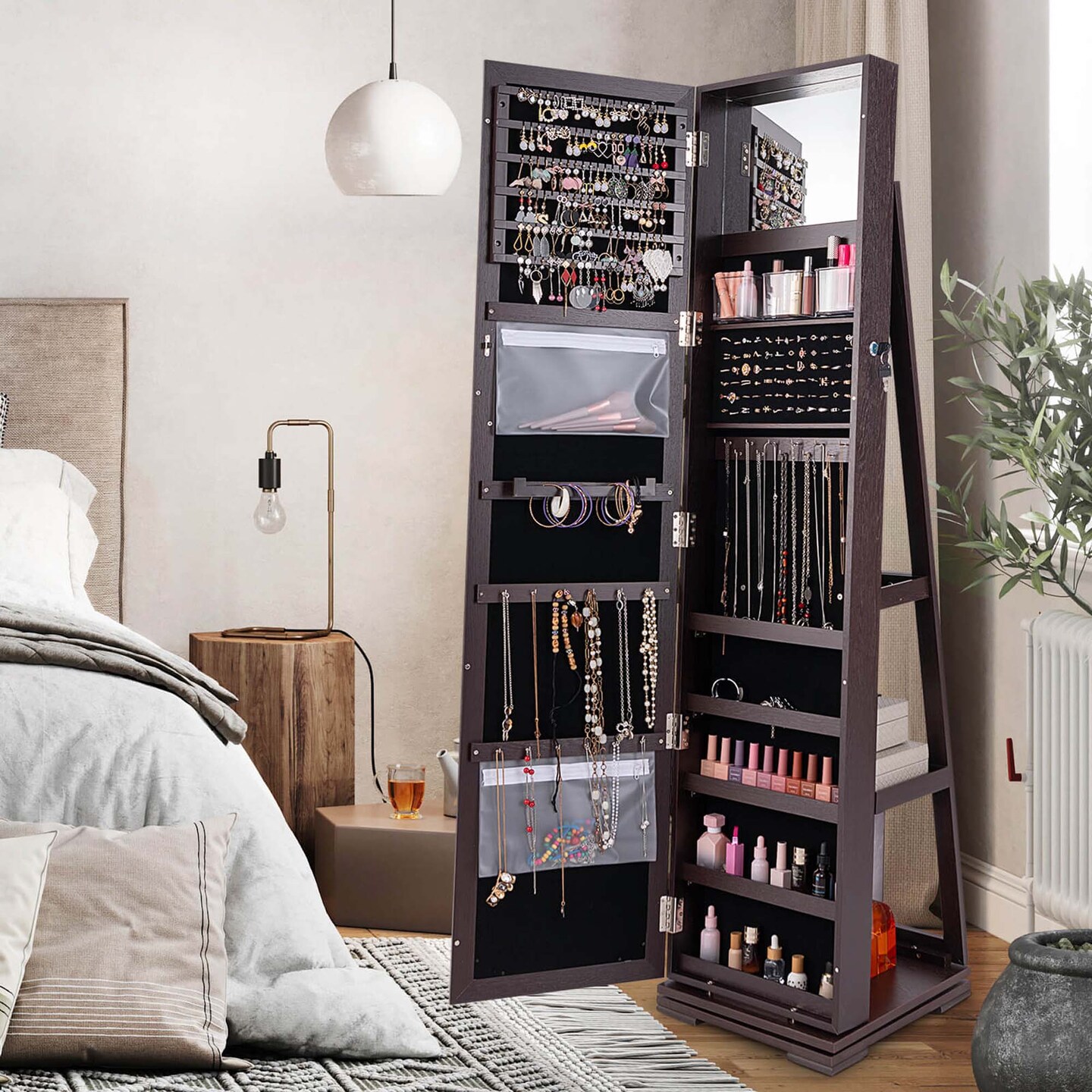 Costway 360degree Rotatable Jewelry Cabinet 2-in-1 Lockable Mirrored Organizer White/Black/Dark Brown/Gray/Blue/Pink/Purple/Dark Gray