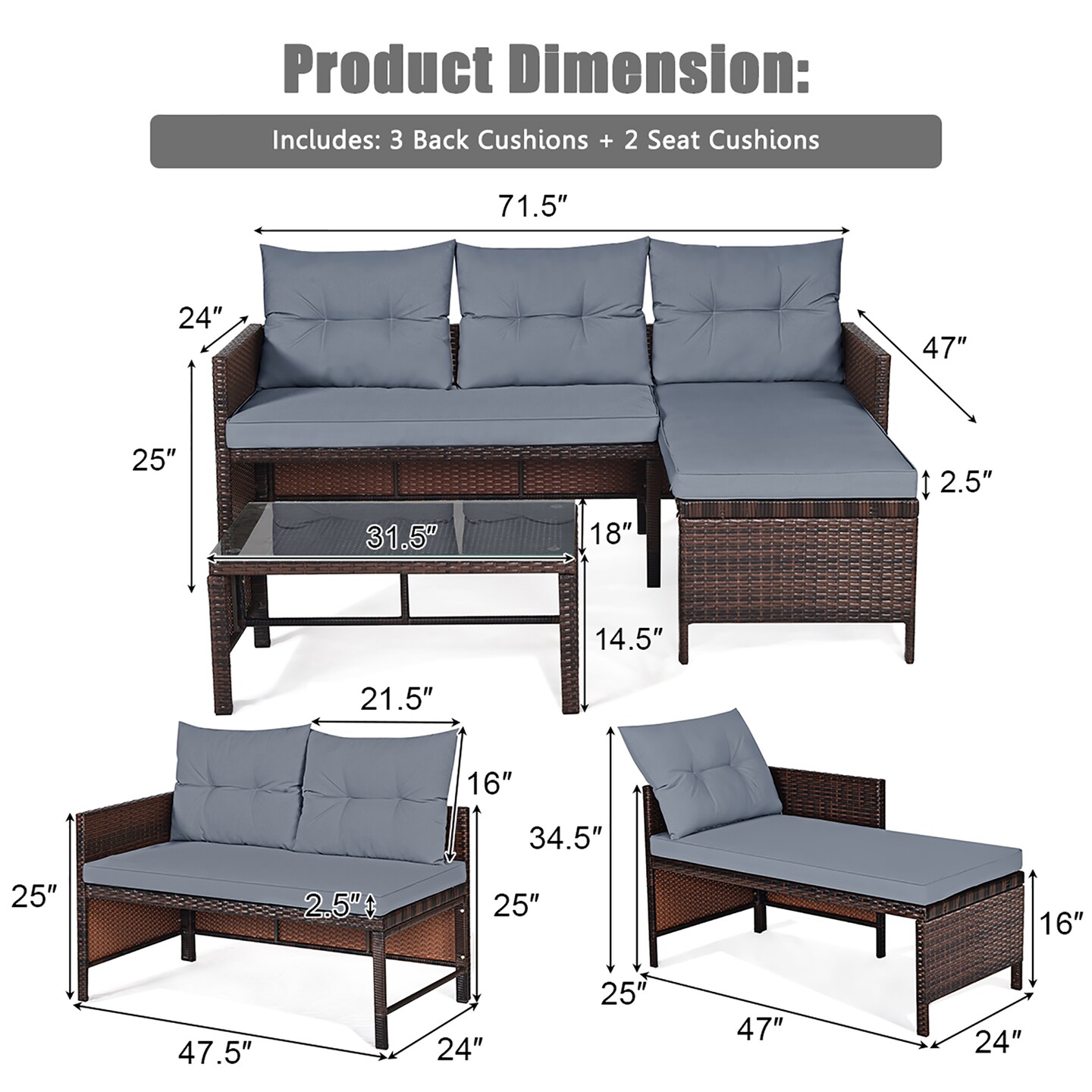 Costway 3PCS Patio Wicker Rattan Sofa Set Outdoor Sectional Conversation Set