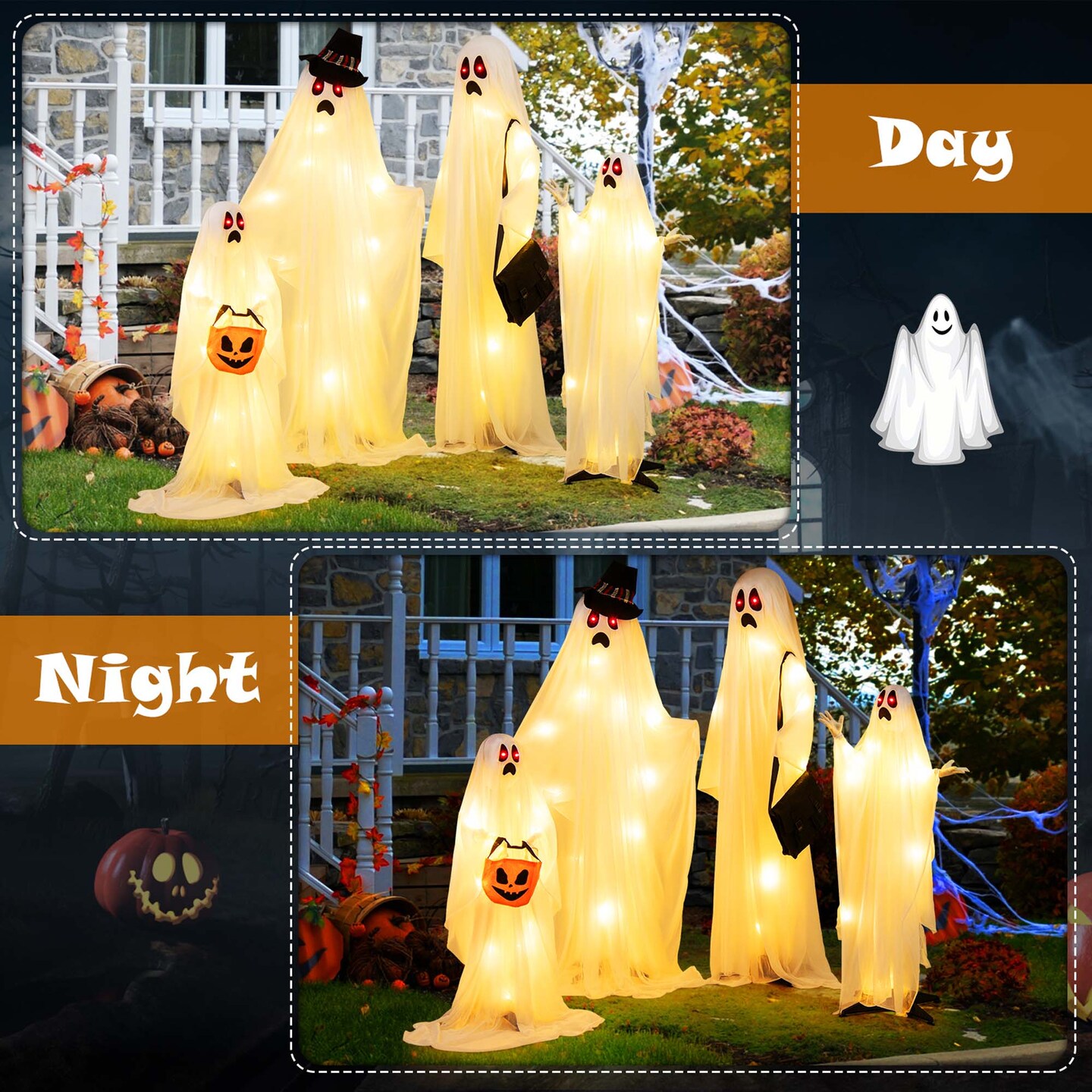 Costway 4 PCS Halloween Light up White Cloth Ghosts Life-size Standing Ghost Family with Red and Warm White LED Lights