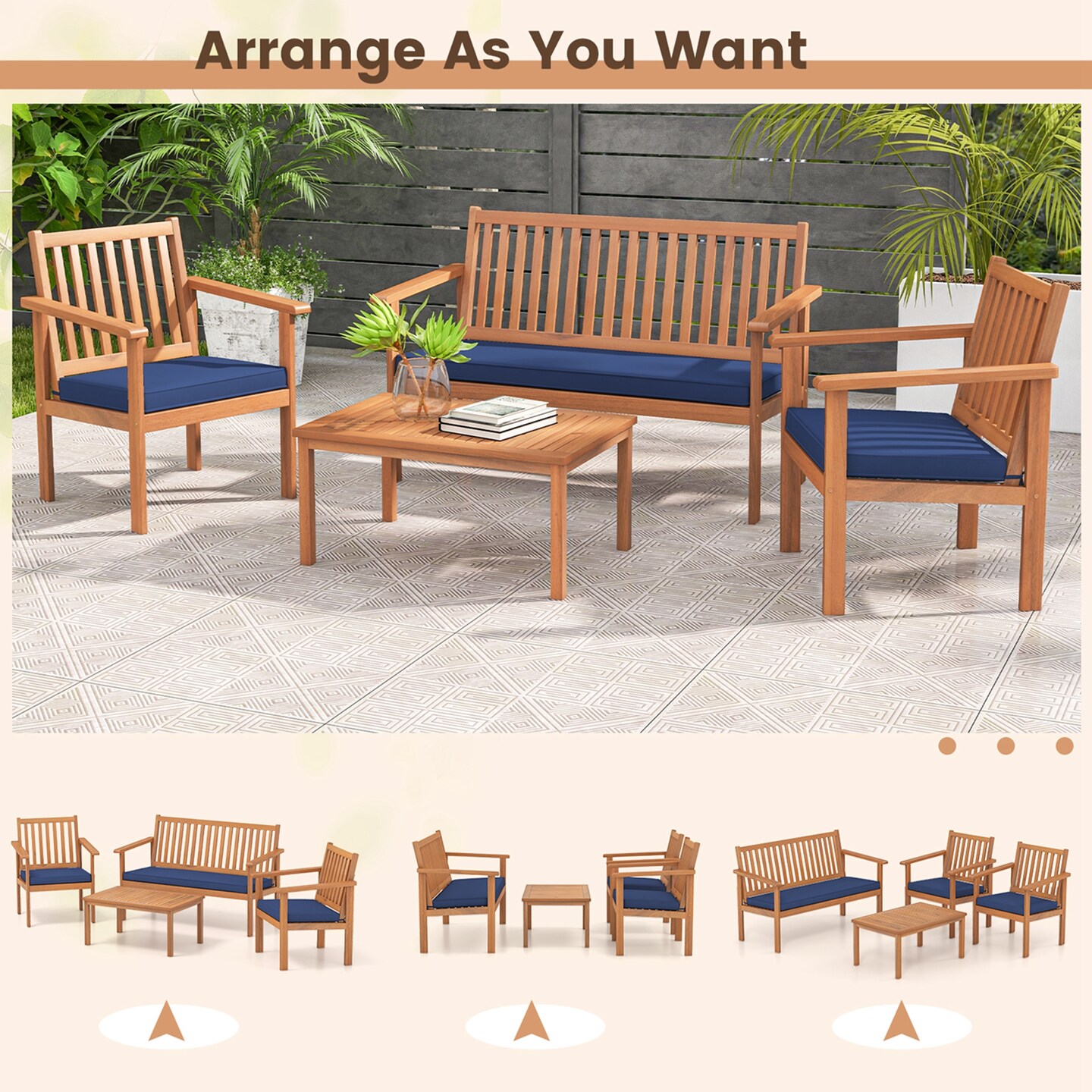 Costway 4 PCS Patio Wood Furniture Set with Loveseat, 2 Chairs & Coffee Table for Porch White/Grey/Navy