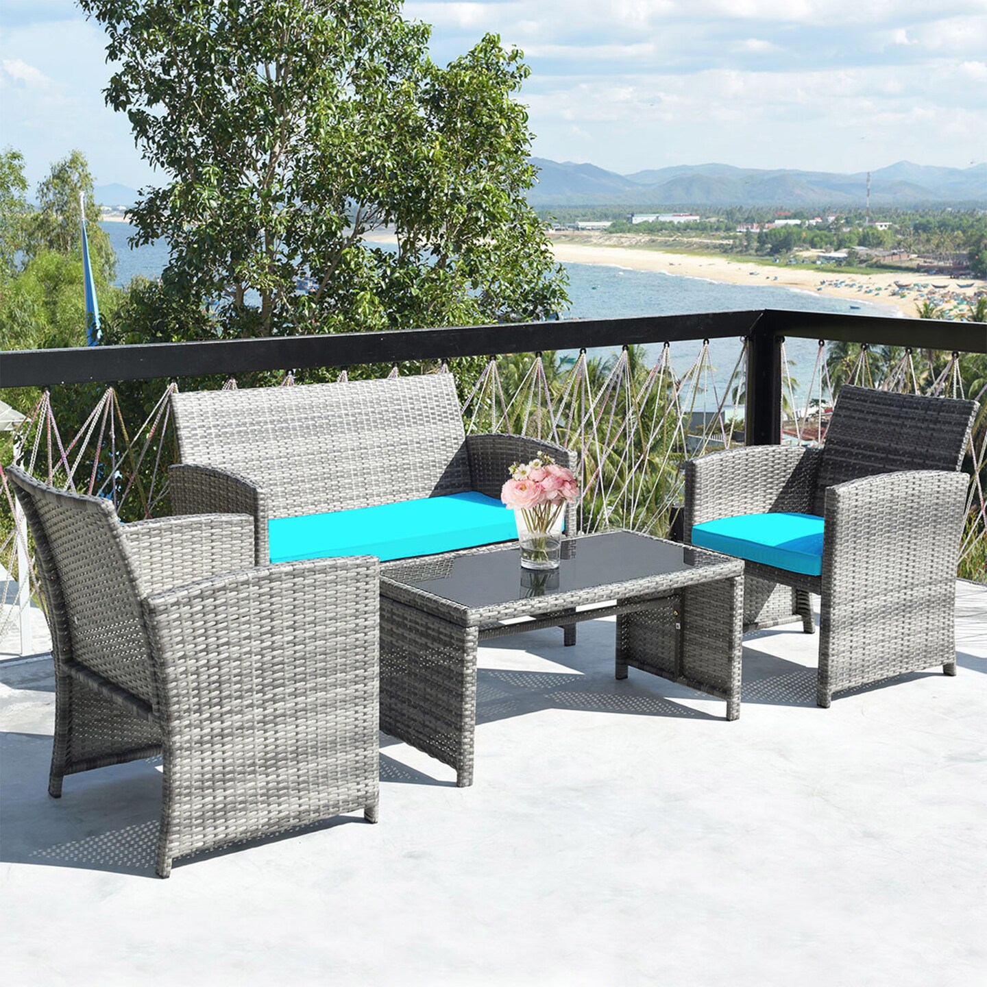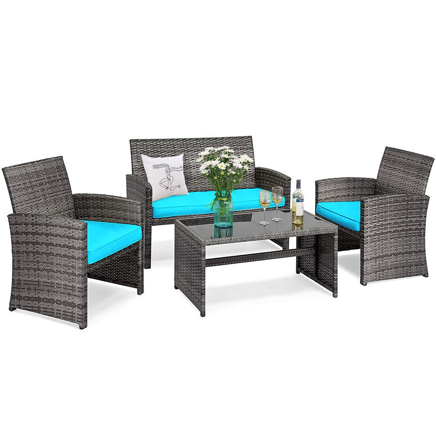 Costway 4PCS Patio Rattan Furniture Set Conversation Glass Table Top Cushioned Turquoise/Red/Grey/Beige/Navy/Black
