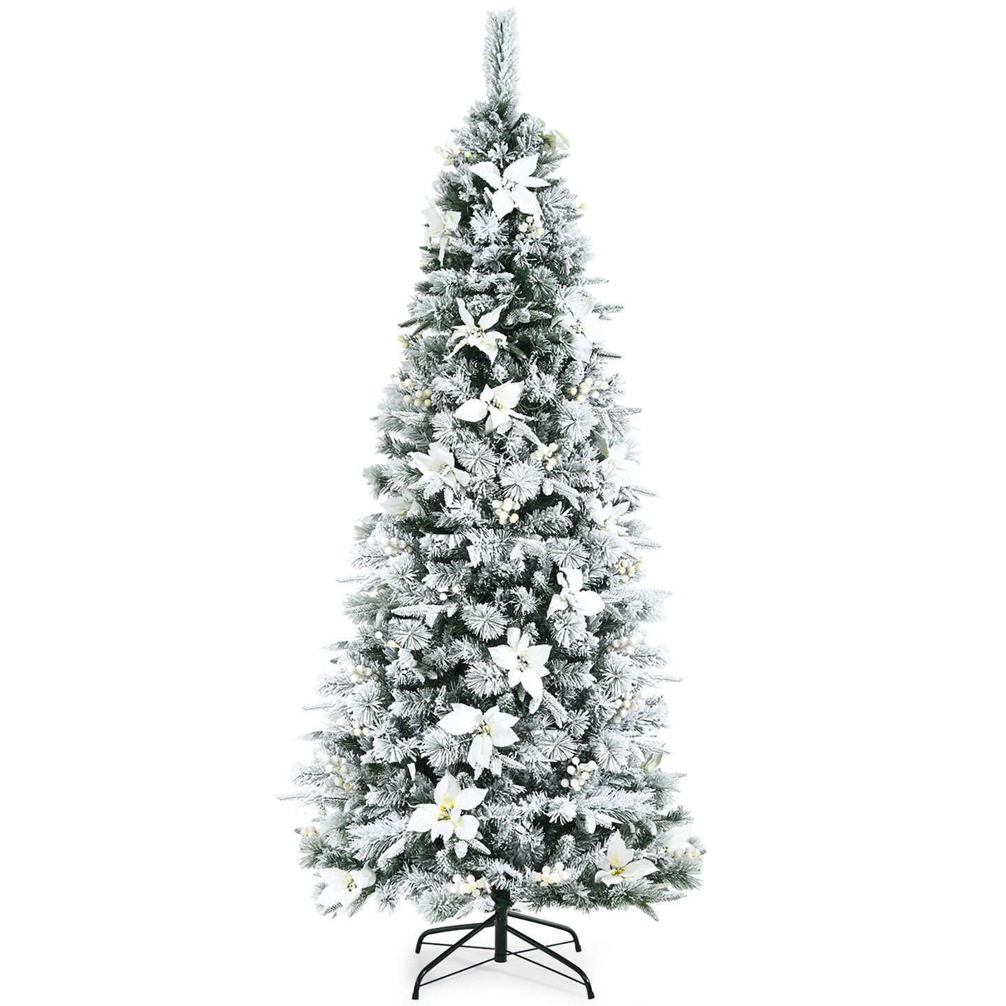 Costway 5ft/6ft/7ft/8ft Snow Flocked Christmas Pencil Tree w/ Berries & Poinsettia Flowers