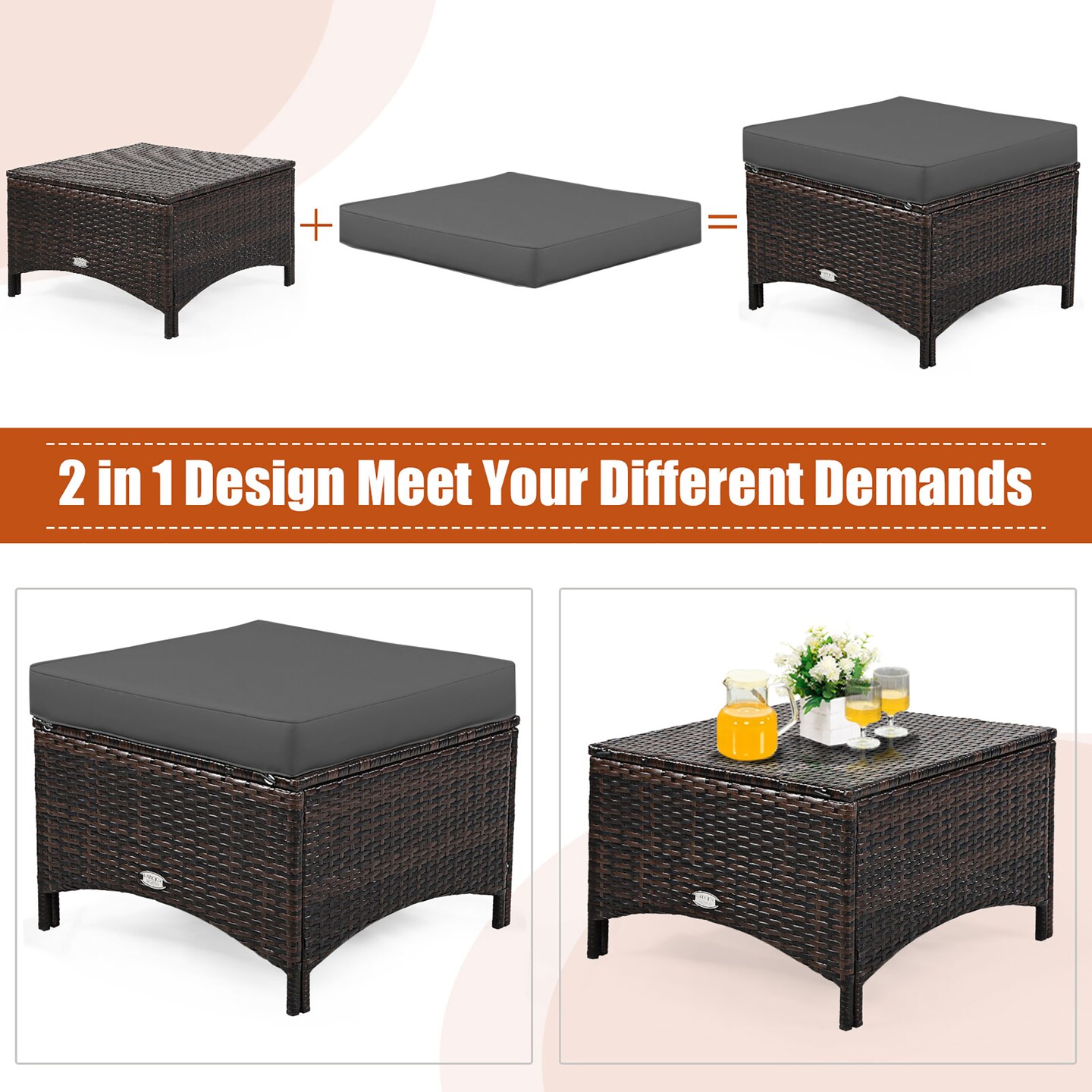 Costway 5PCS Patio Rattan Furniture Set Loveseat Sofa Ottoman W/Red\White Cushion