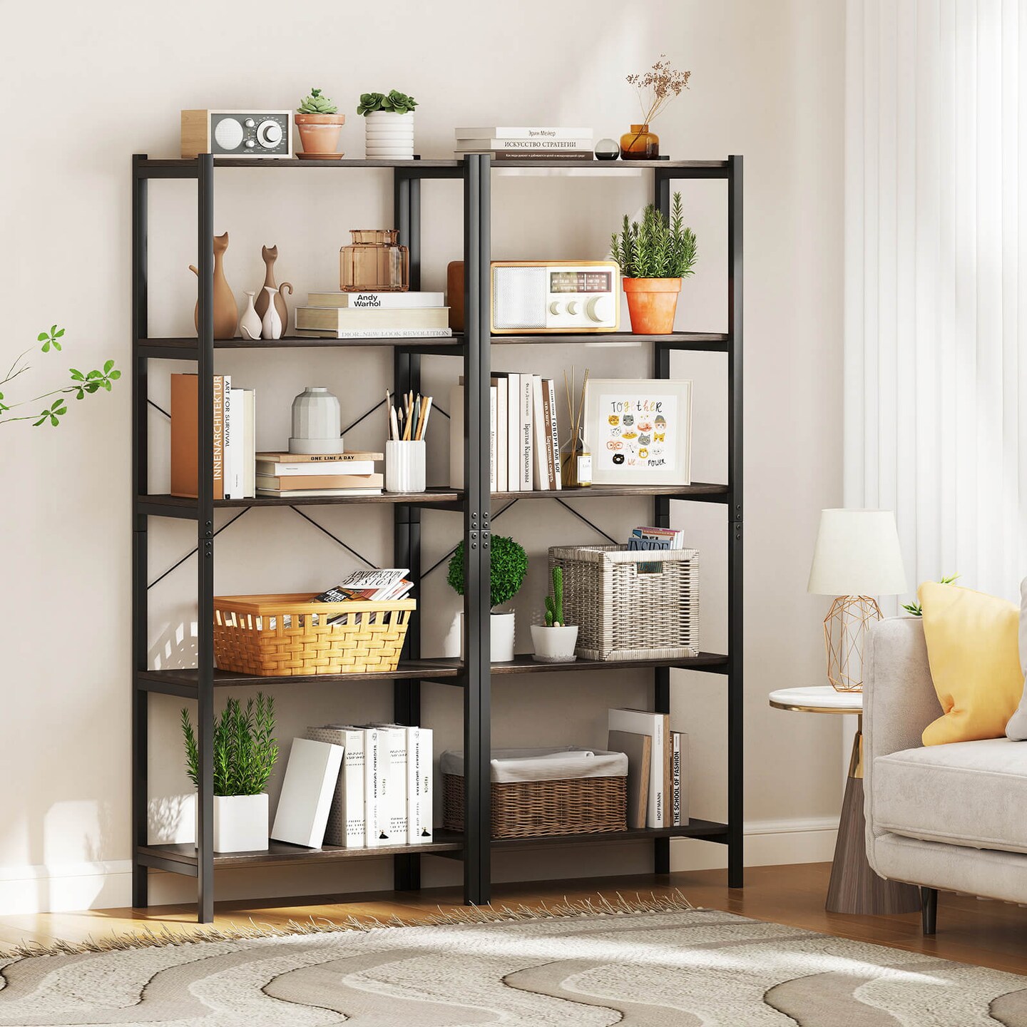Costway 5-Tier Rustic Industrial Bookshelf Wood Display Storage Rack with Metal Frame