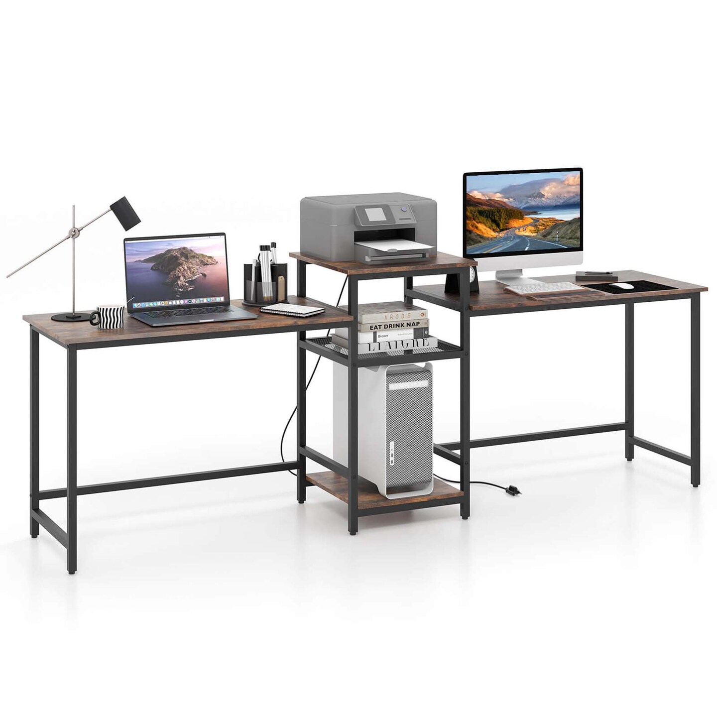 Costway 97 Inch Two Person Desk Double Computer Desk with Power Outlets Printer Stand