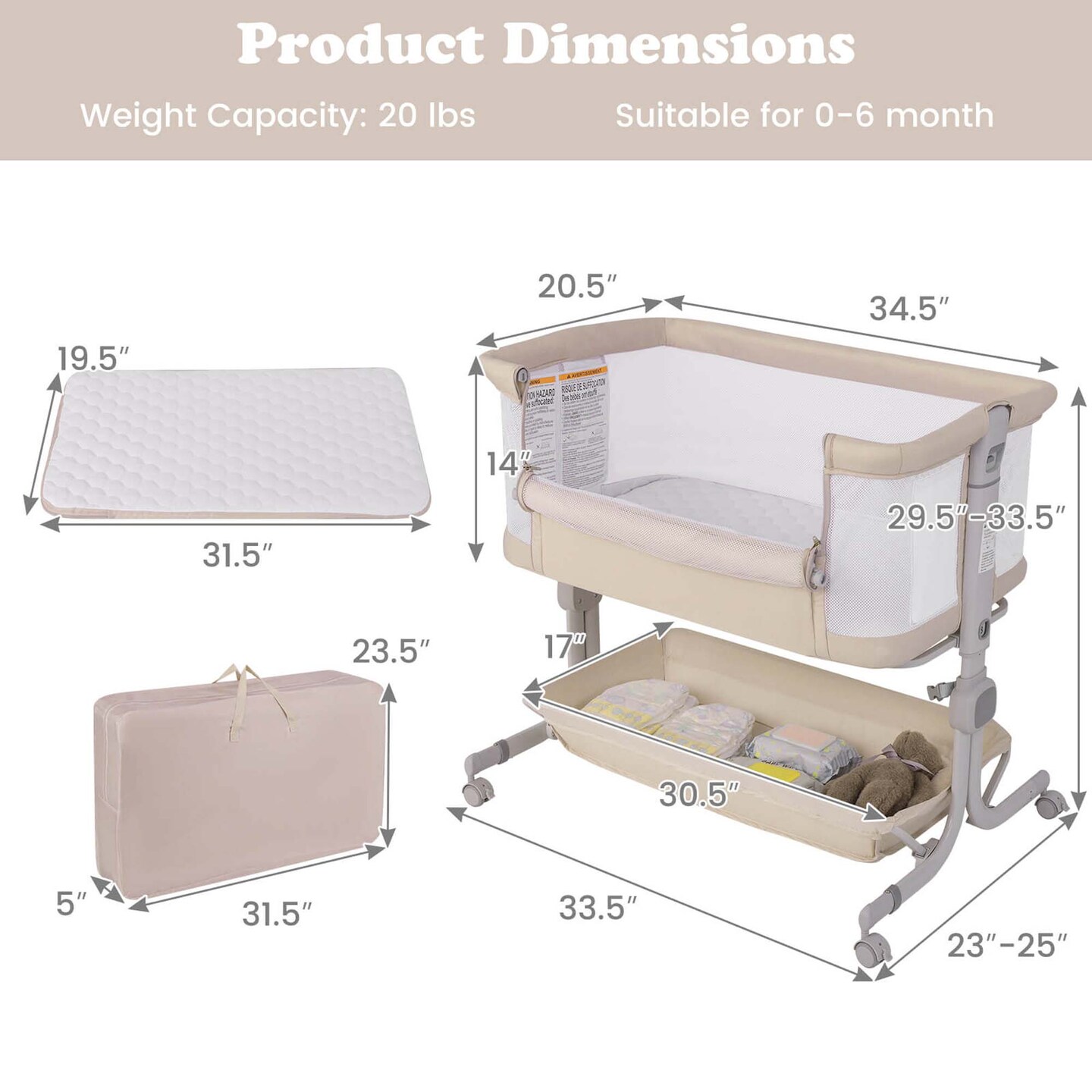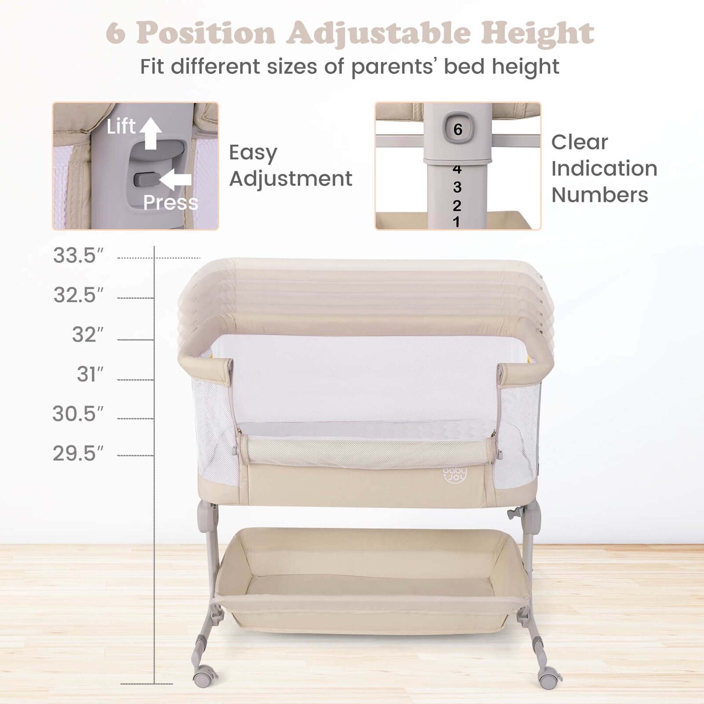 Costway Baby Bassinet Bedside Sleeper with 6-Level Adjustable Height Beige/Pink/Gray