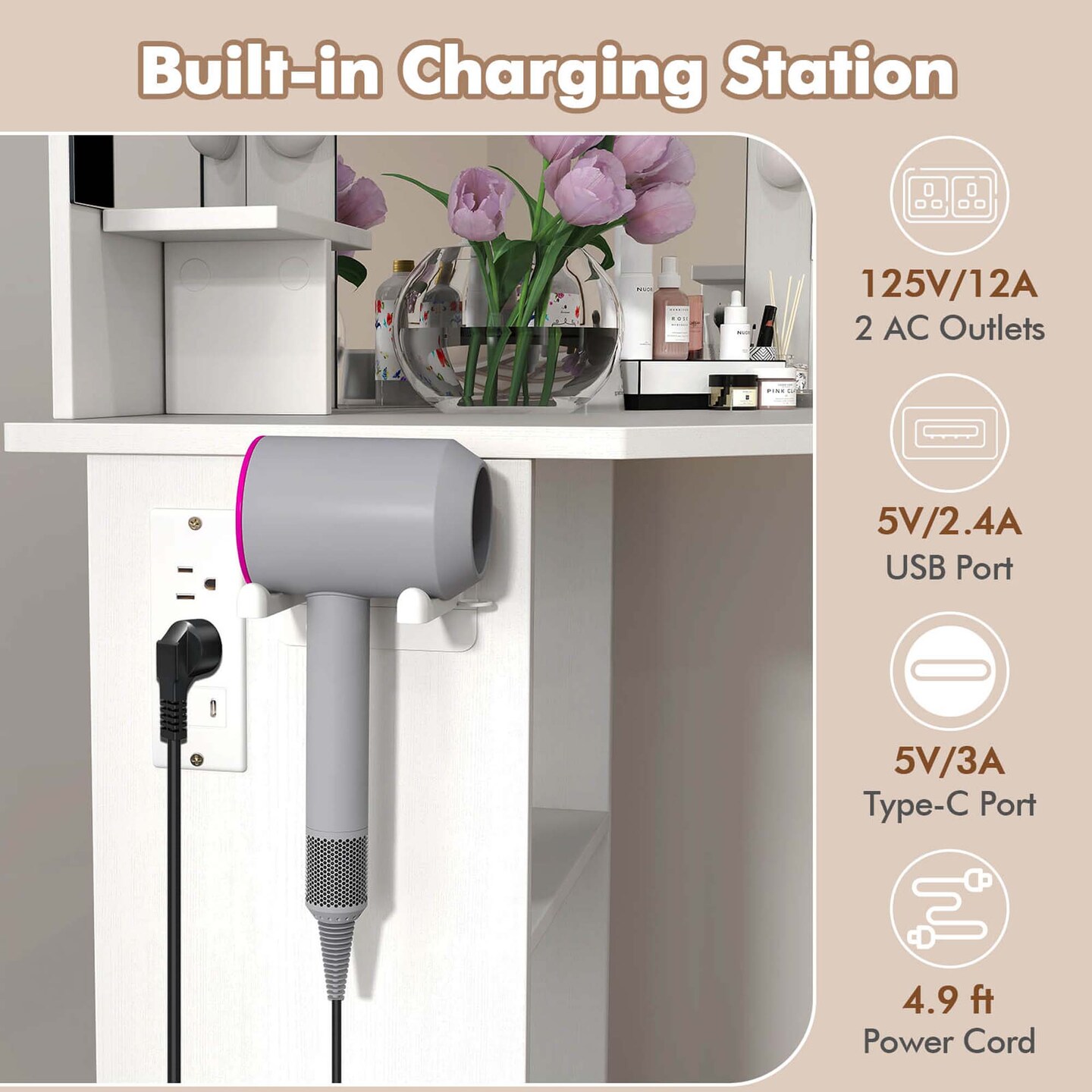 Costway Corner Vanity Desk Cosmetic Vanity Station with LED Mirror,& Power Outlets Black/White