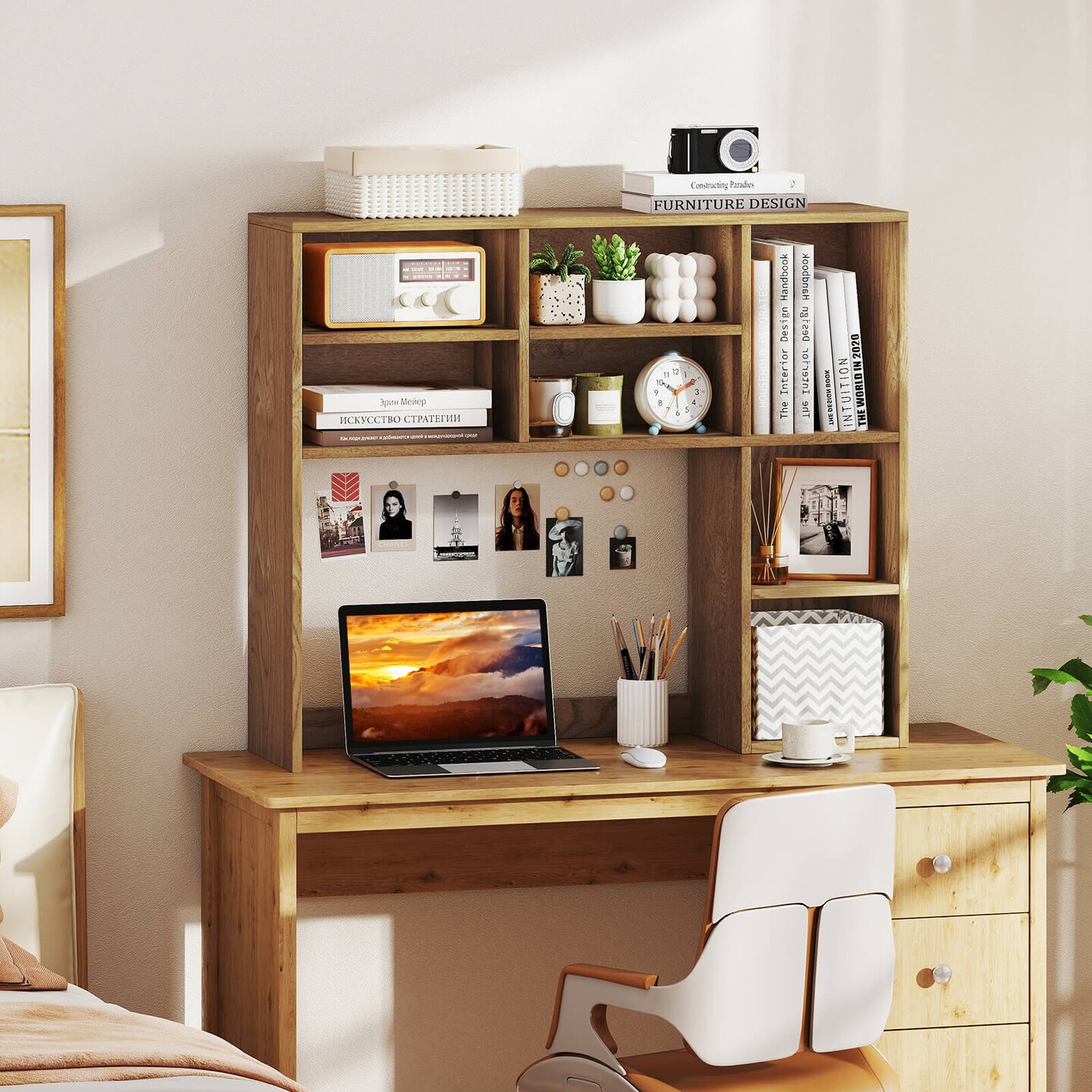 Costway Desktop Bookshelf Desk Storage Hutch with 7 Open Cubbies & 3 Adjustable Shelves Natural/Beige/Gray/Brown/White