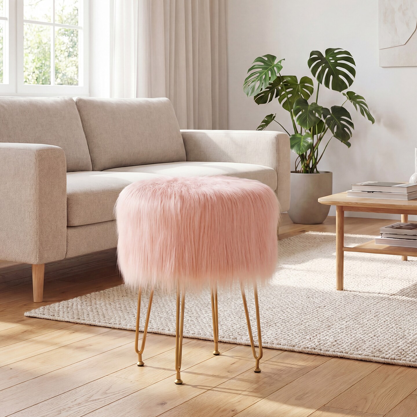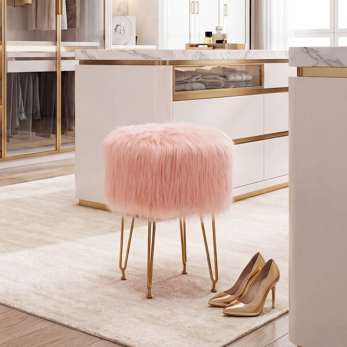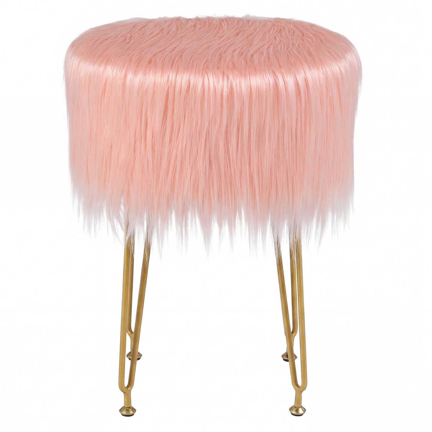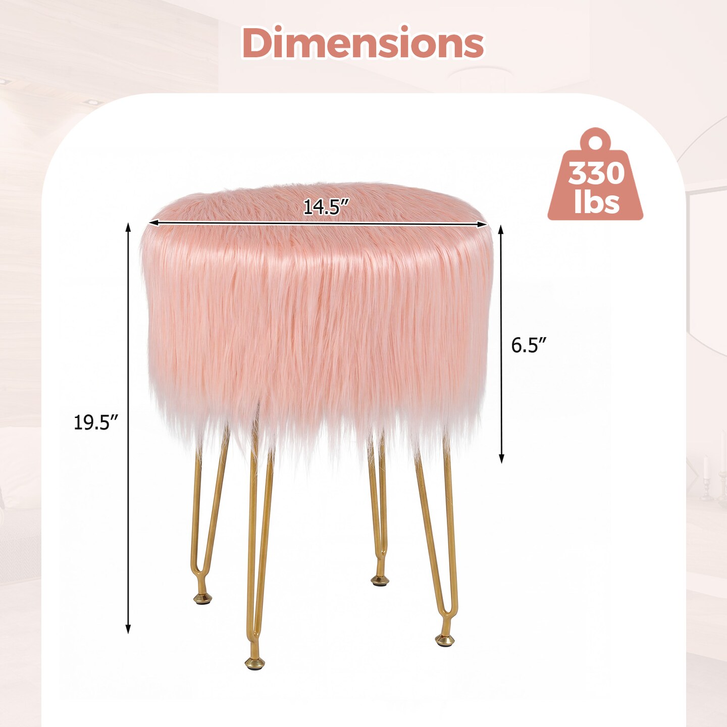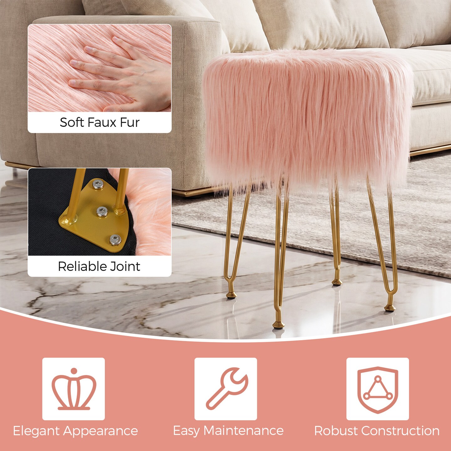 Costway Faux Fur Vanity Chair Makeup Stool Furry Padded Seat Round Ottoman Pink/White