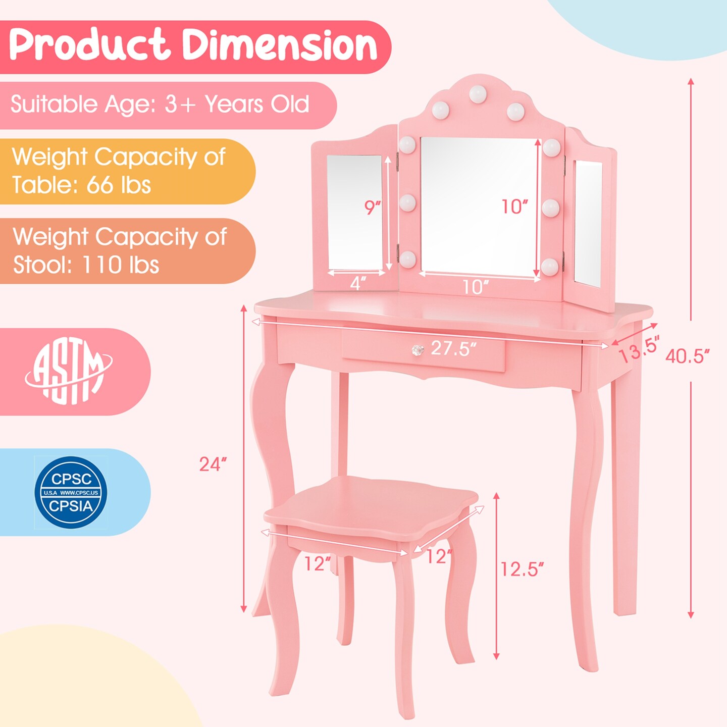 Costway Kid Vanity Table Stool Set Tri-Folding Mirror Adjustable 3-Color LED Lights Pink/White