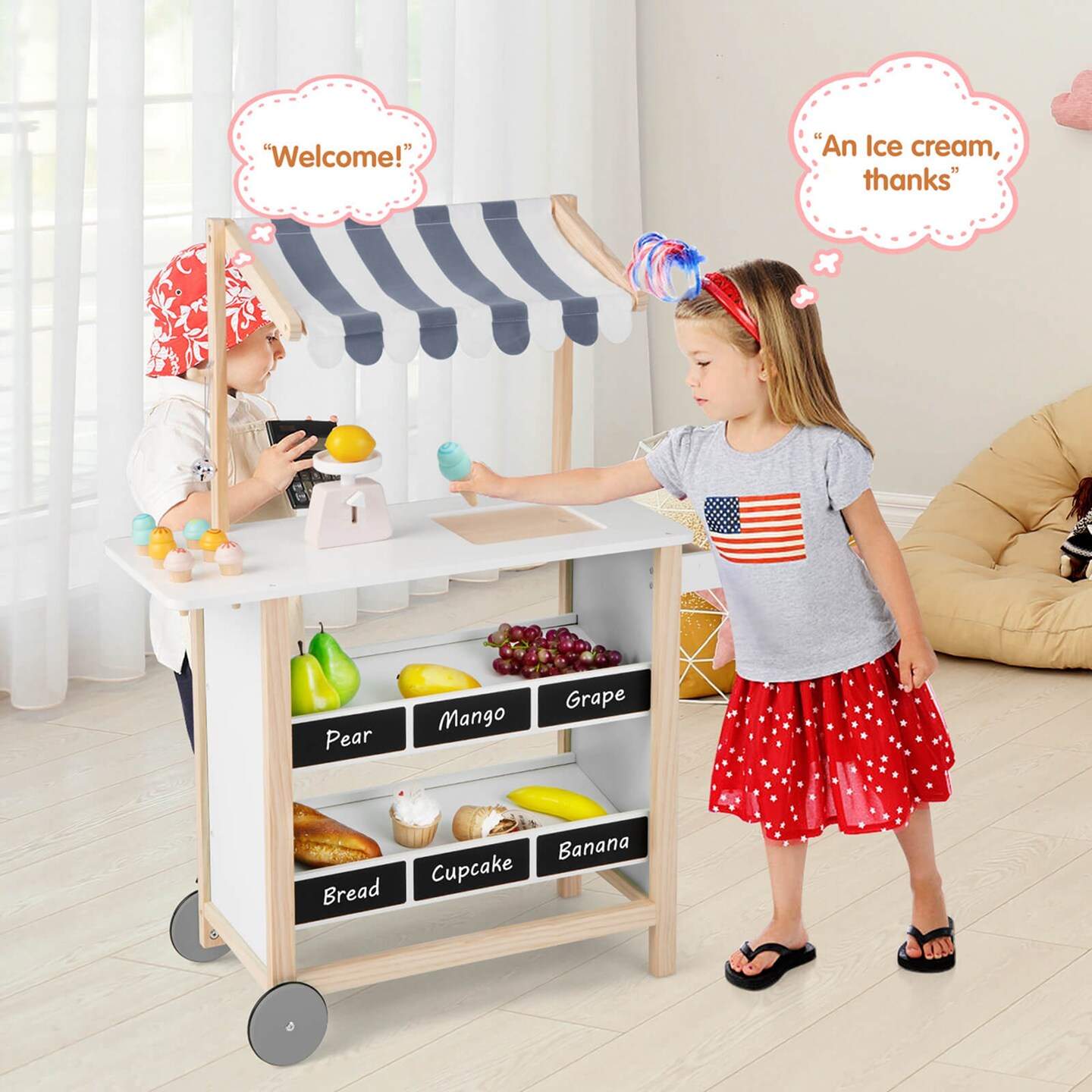 Costway Kids Ice Cream Cart Wooden Toddler Farmers Market Stand with Chalkboard & Storage White/Green