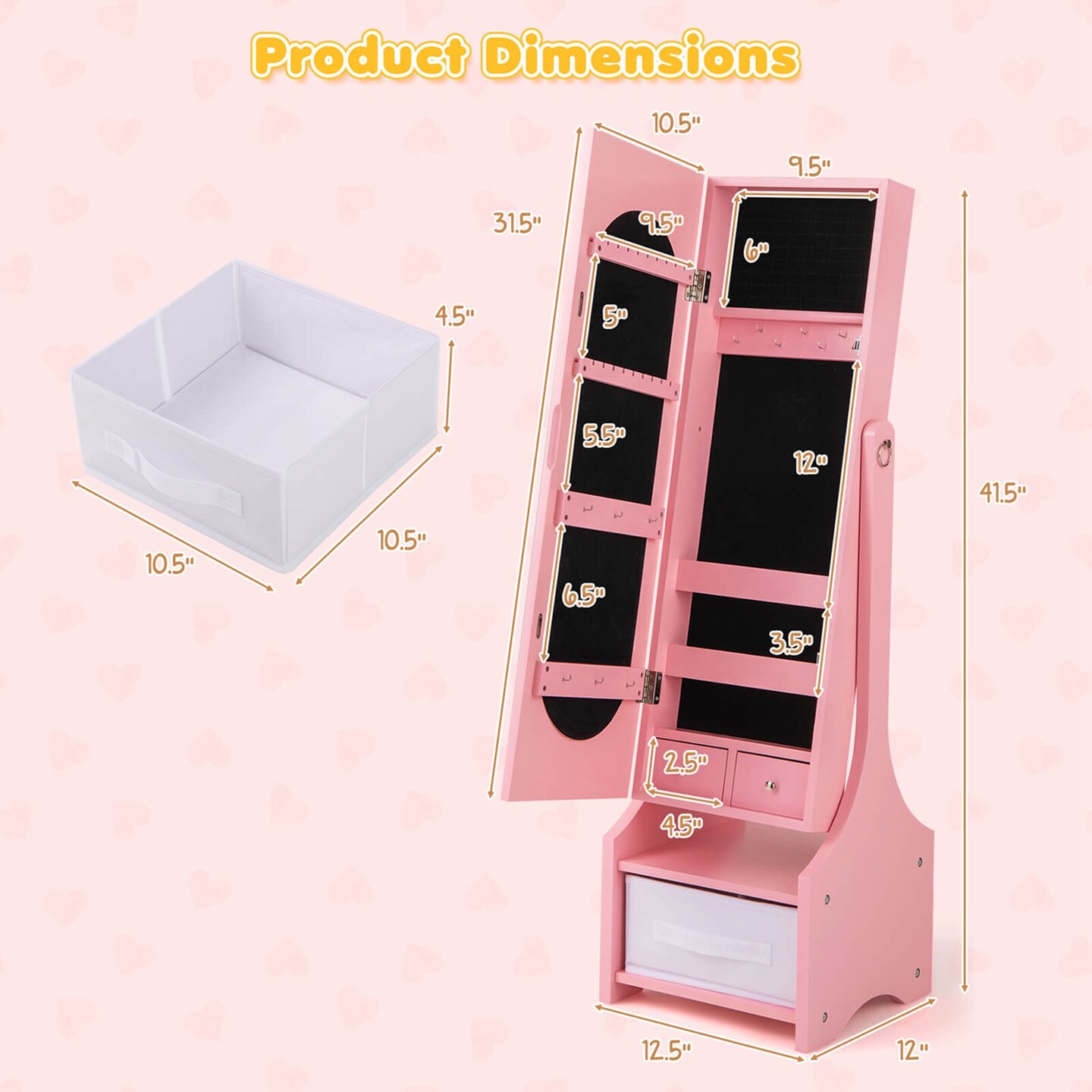 Costway Kids Jewelry Cabinet with Full-Length Mirror Drawer 2 Adjustable Tilt Angles White/Pink