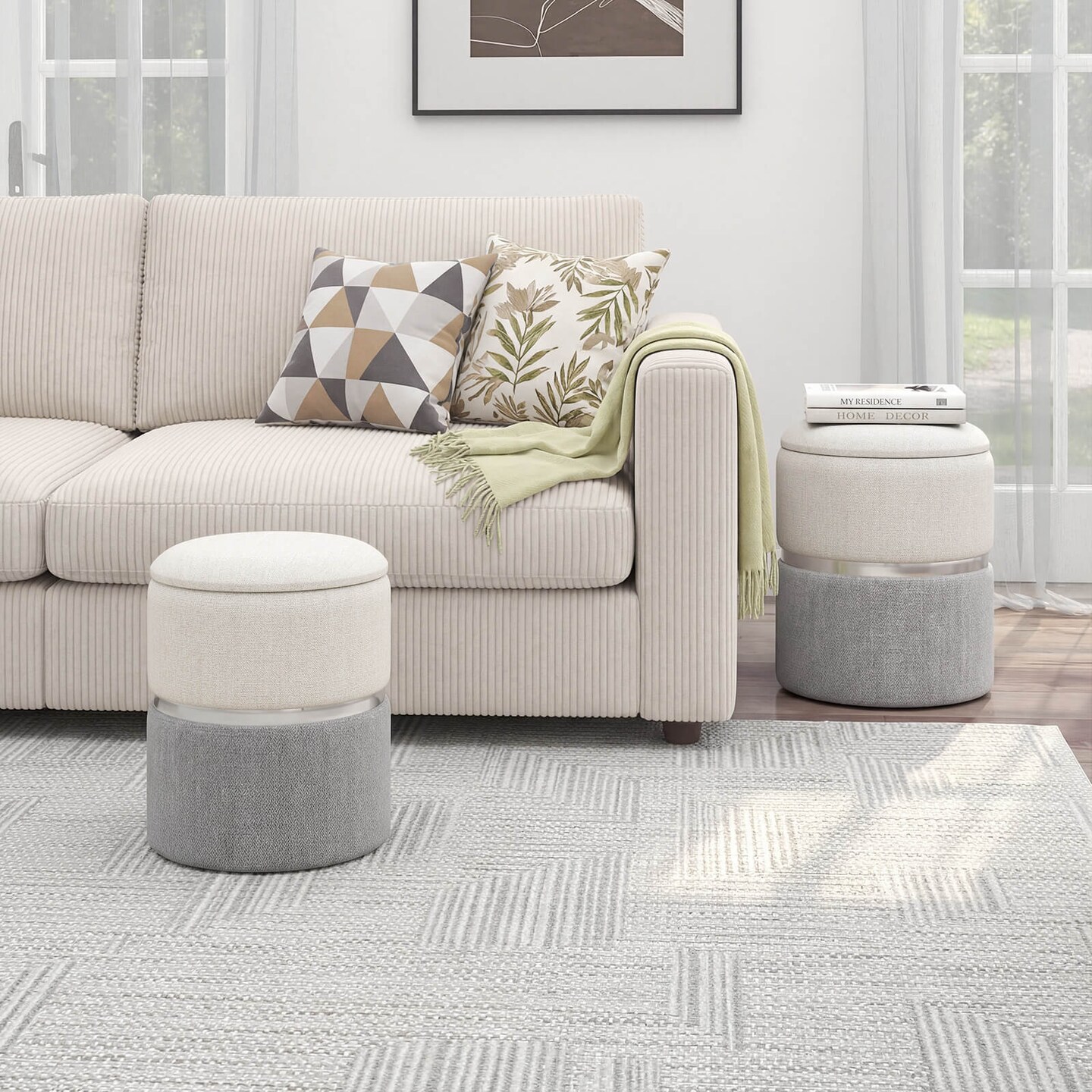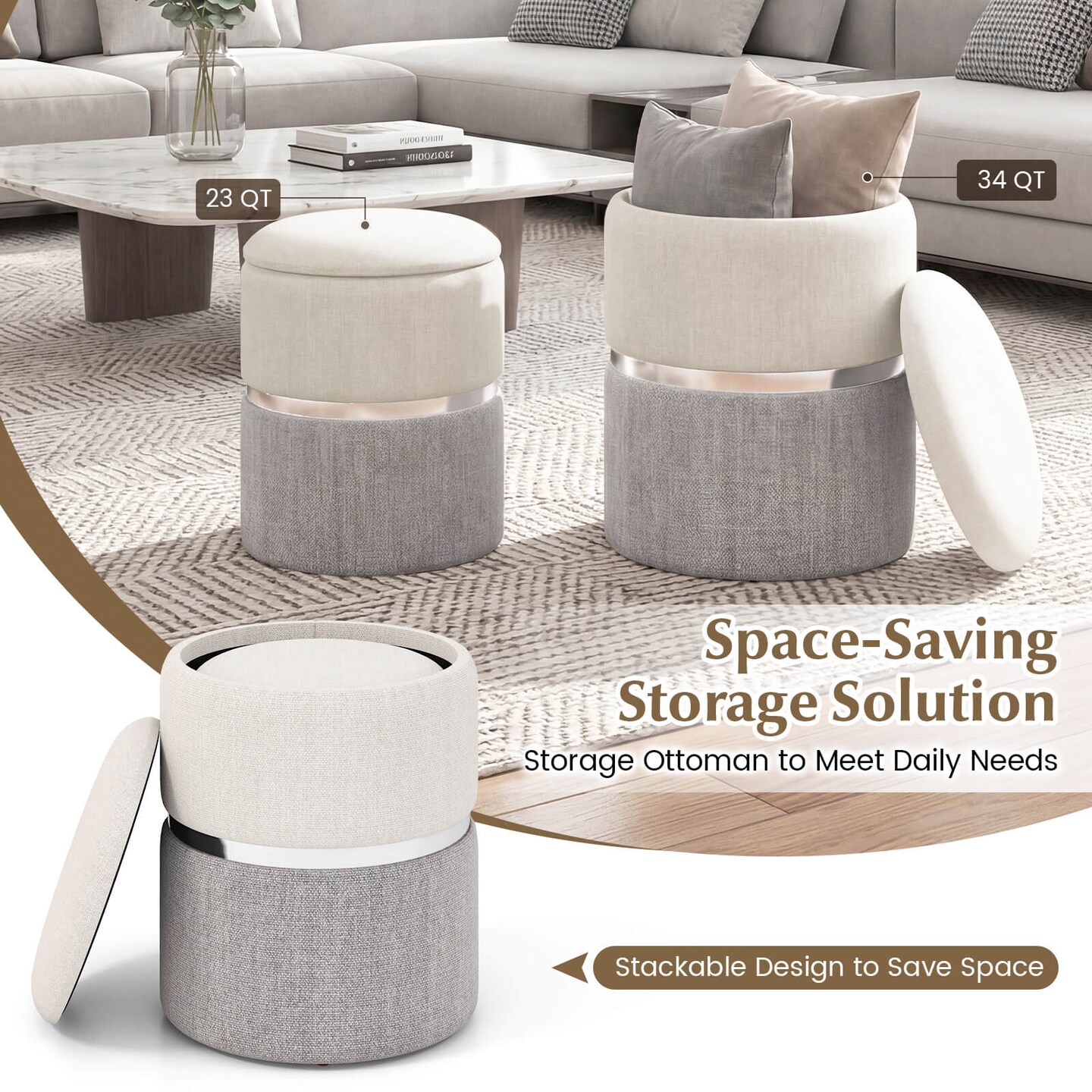 Costway Linen Fabric Storage Ottoman Set of 2 Modern Round Ottoman with Storage for Bedroom