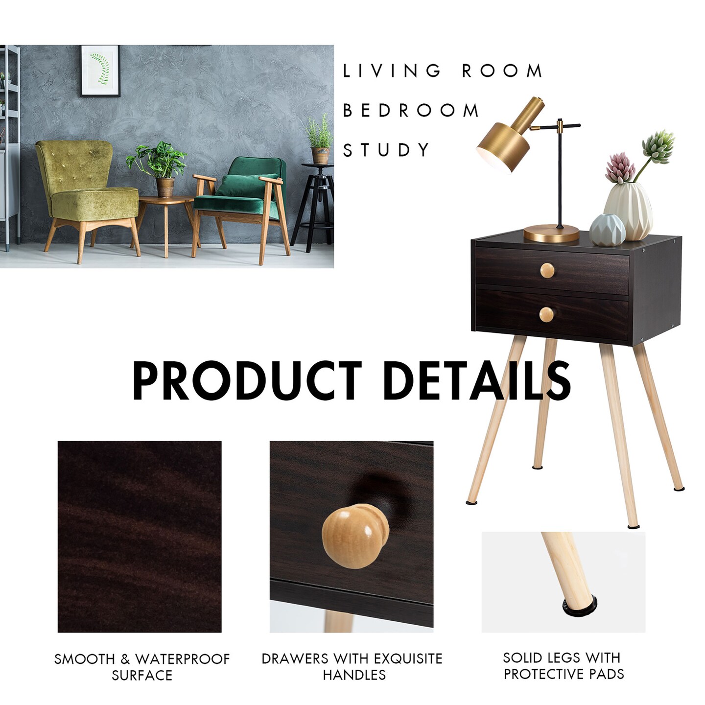Costway Mid Century Modern 2 Drawers Nightstand Sofa Side Table End Table Espresso