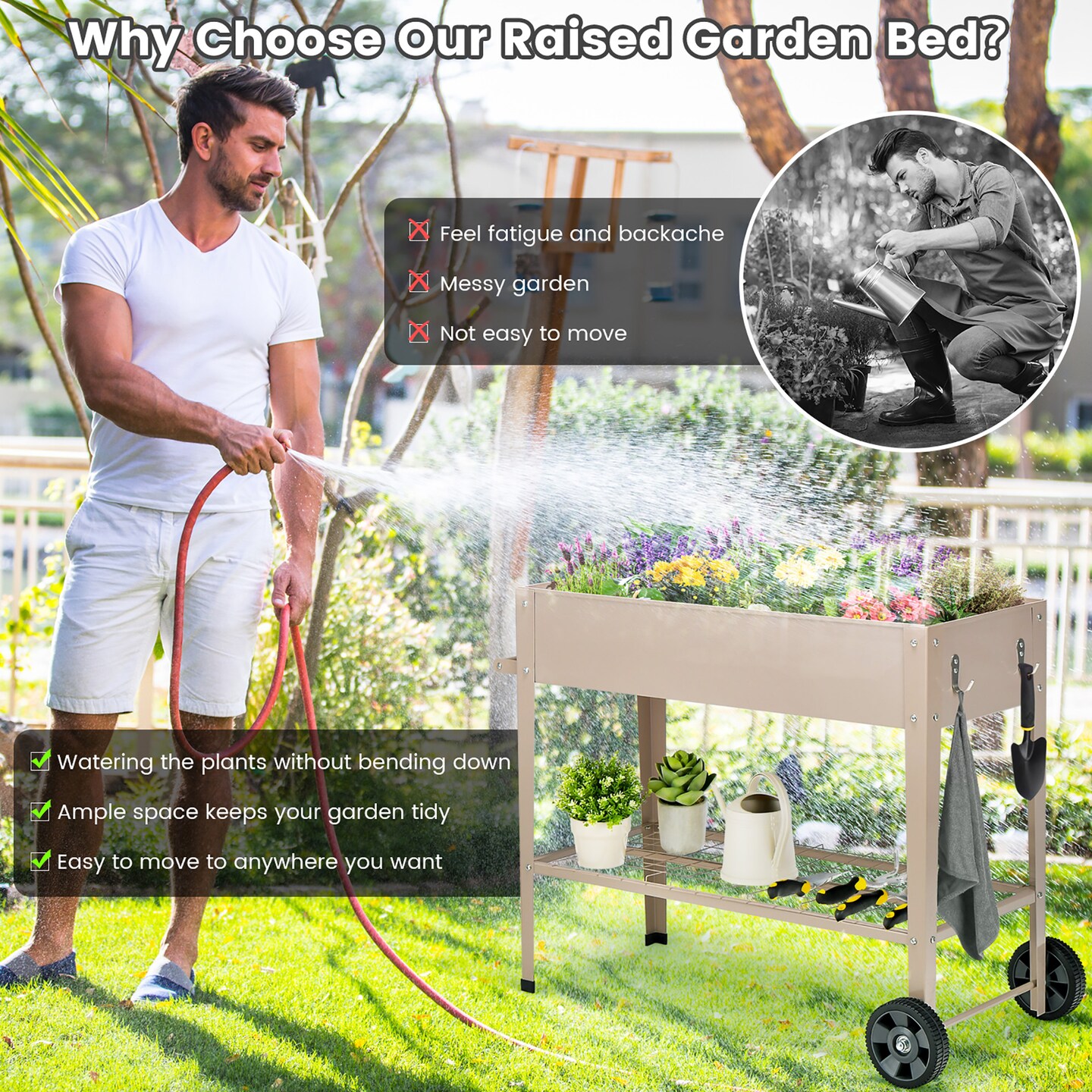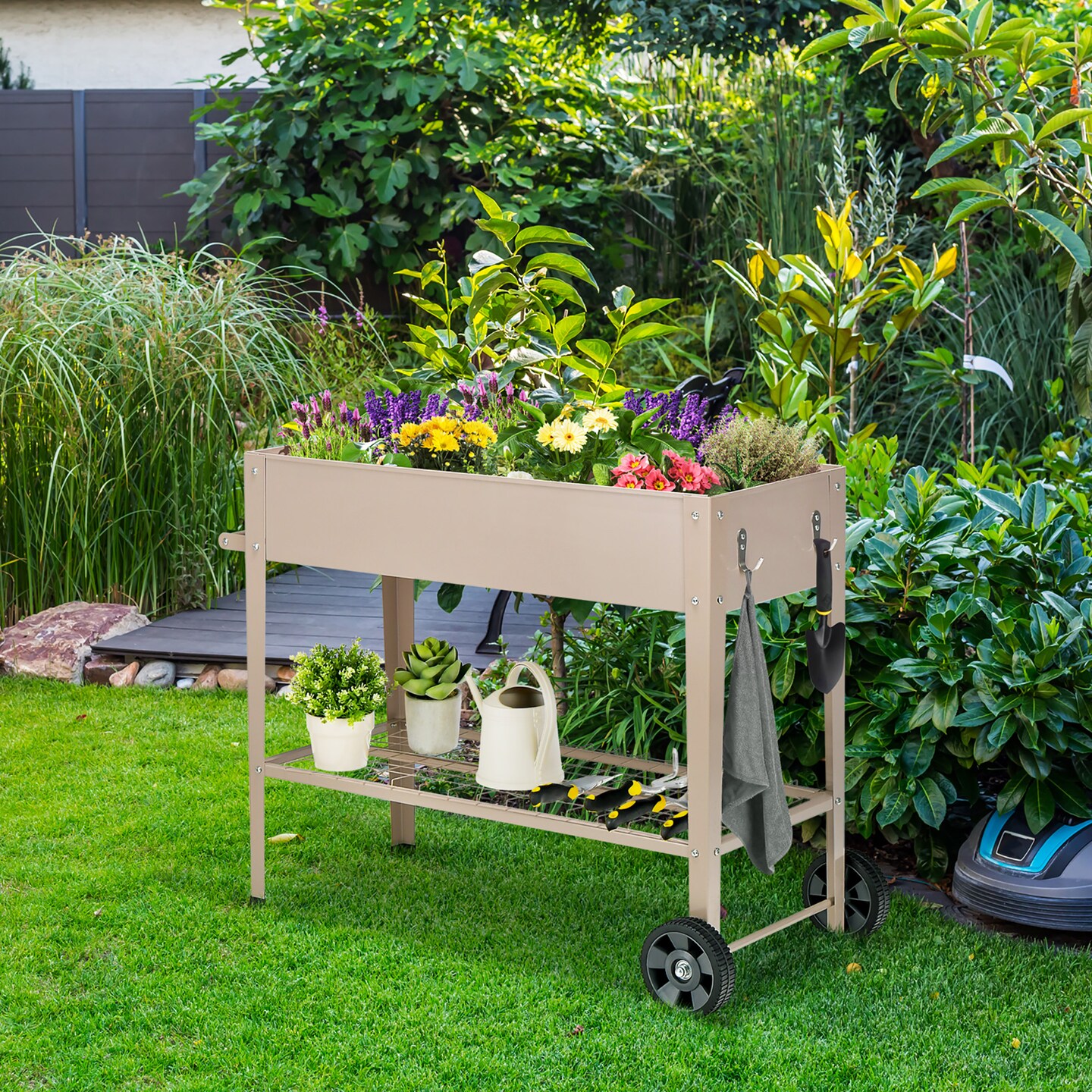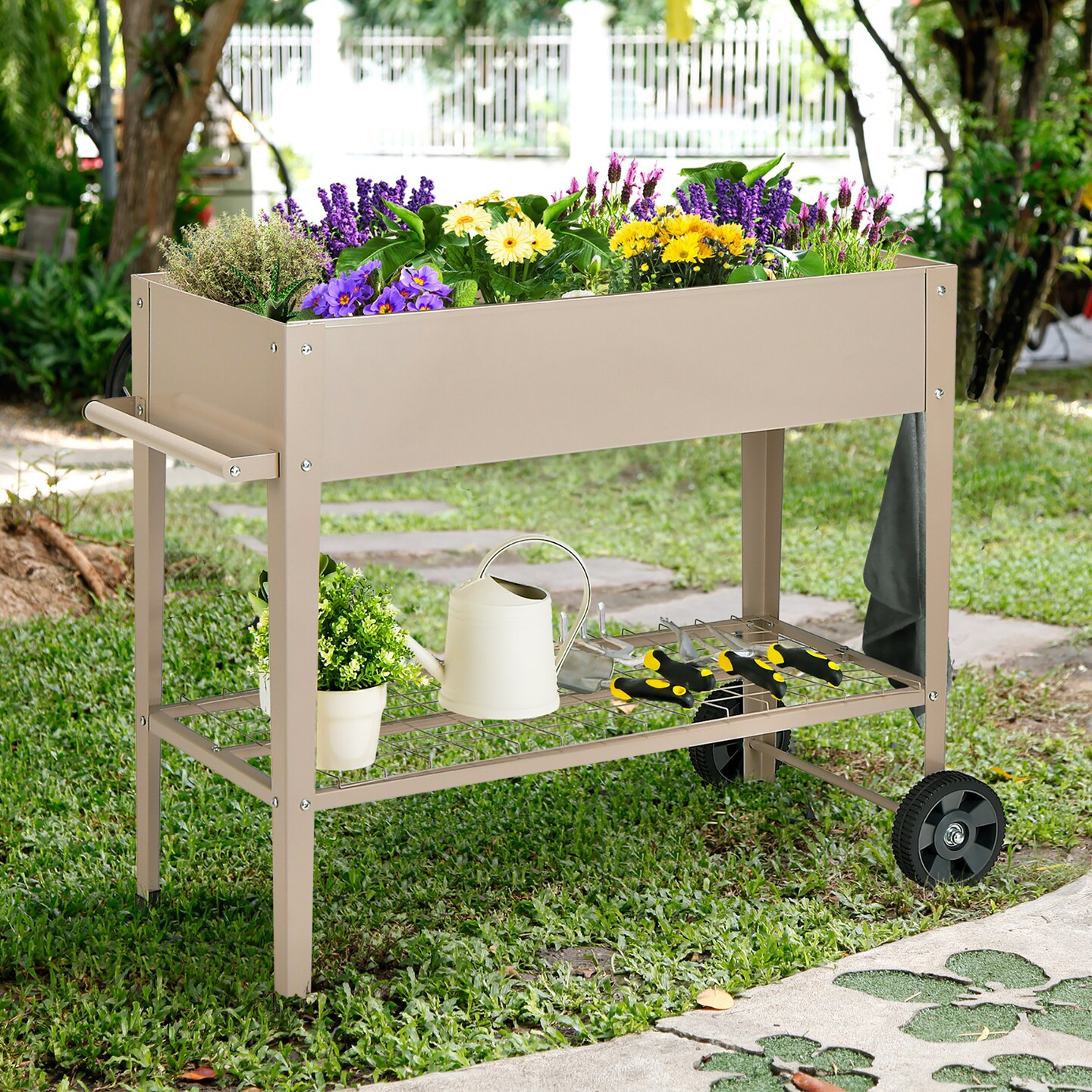 Costway Planter Box Raised Garden Bed Elevated on Wheels Steel Planter with Shelf Hooks