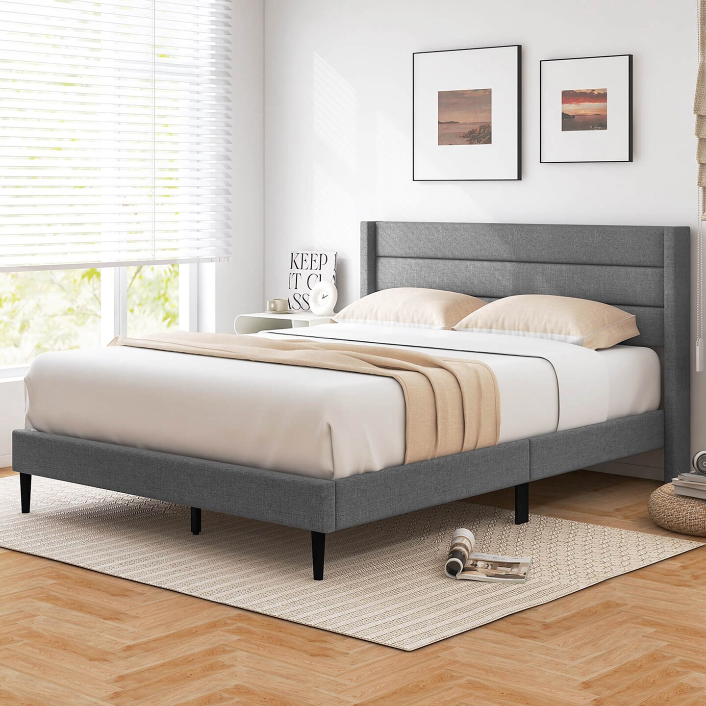 Costway Queen/Twin Bed Frame with Wingback Headboard Linen Upholstered Platform Bed Grey