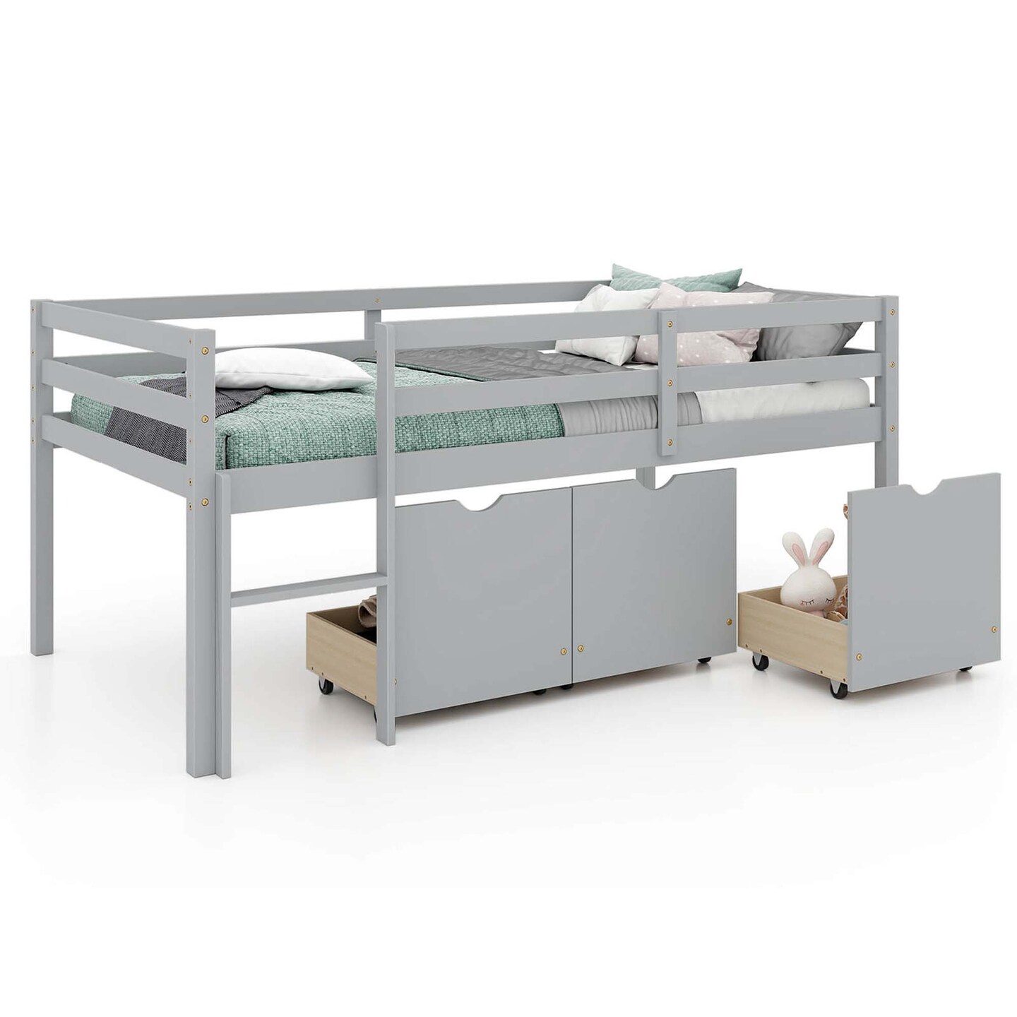 Costway Twin Size Low Loft Bed with 3 Drawers Ladder & Full-length Guardrails Storage White/Grey