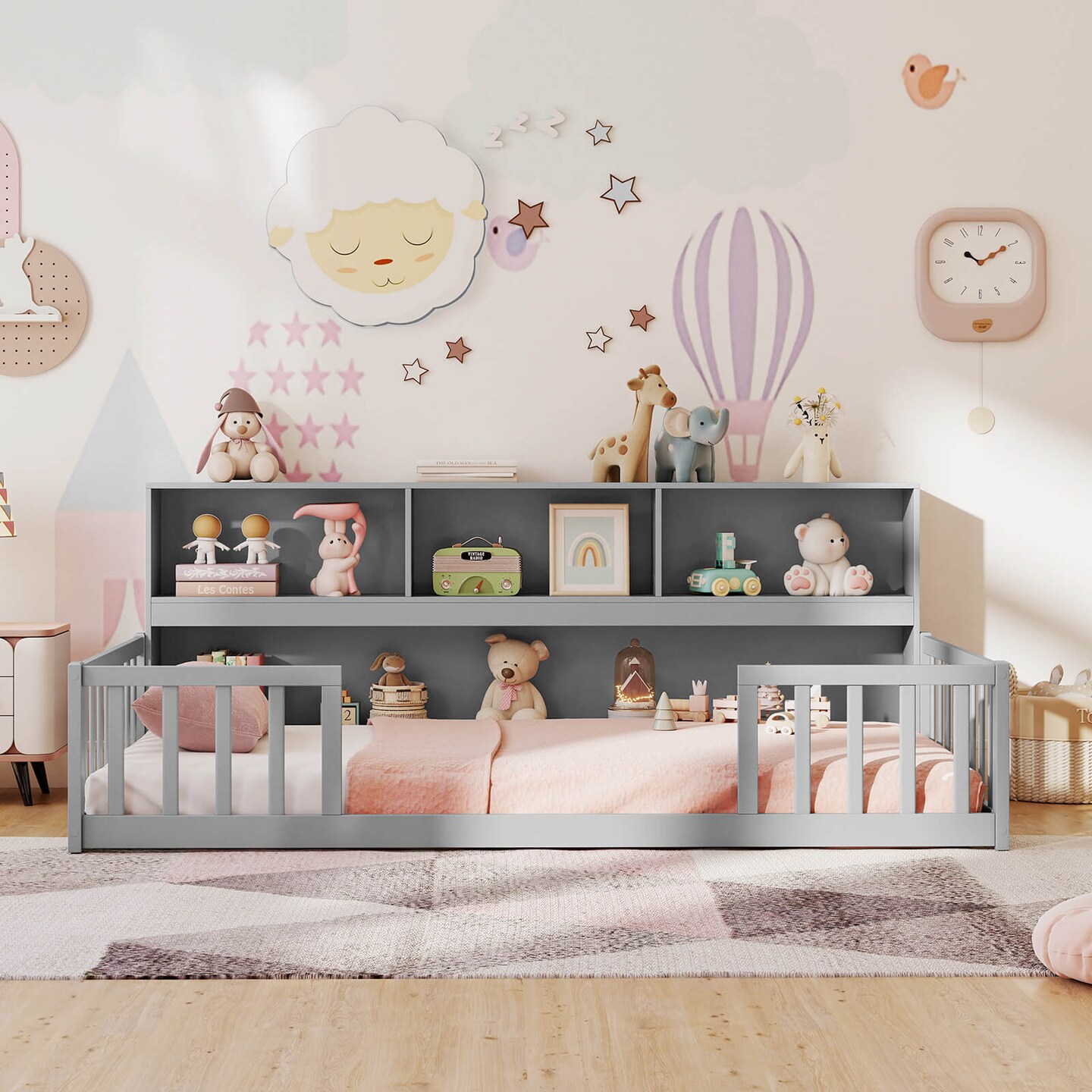 Costway Twin/Full Size Montessori Floor Bed with Bookcase Storage Shelves & Safety Fence Rails White/Gray