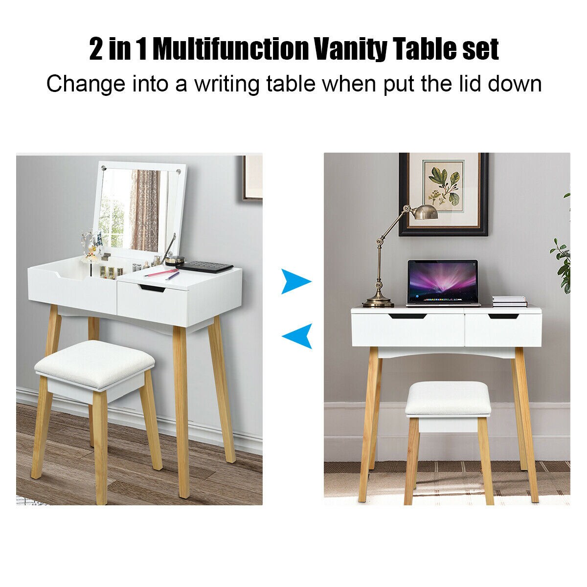 Costway Vanity Makeup Table Cushioned Stool Set W/Flip Top Mirror &1 Drawer Writing Desk