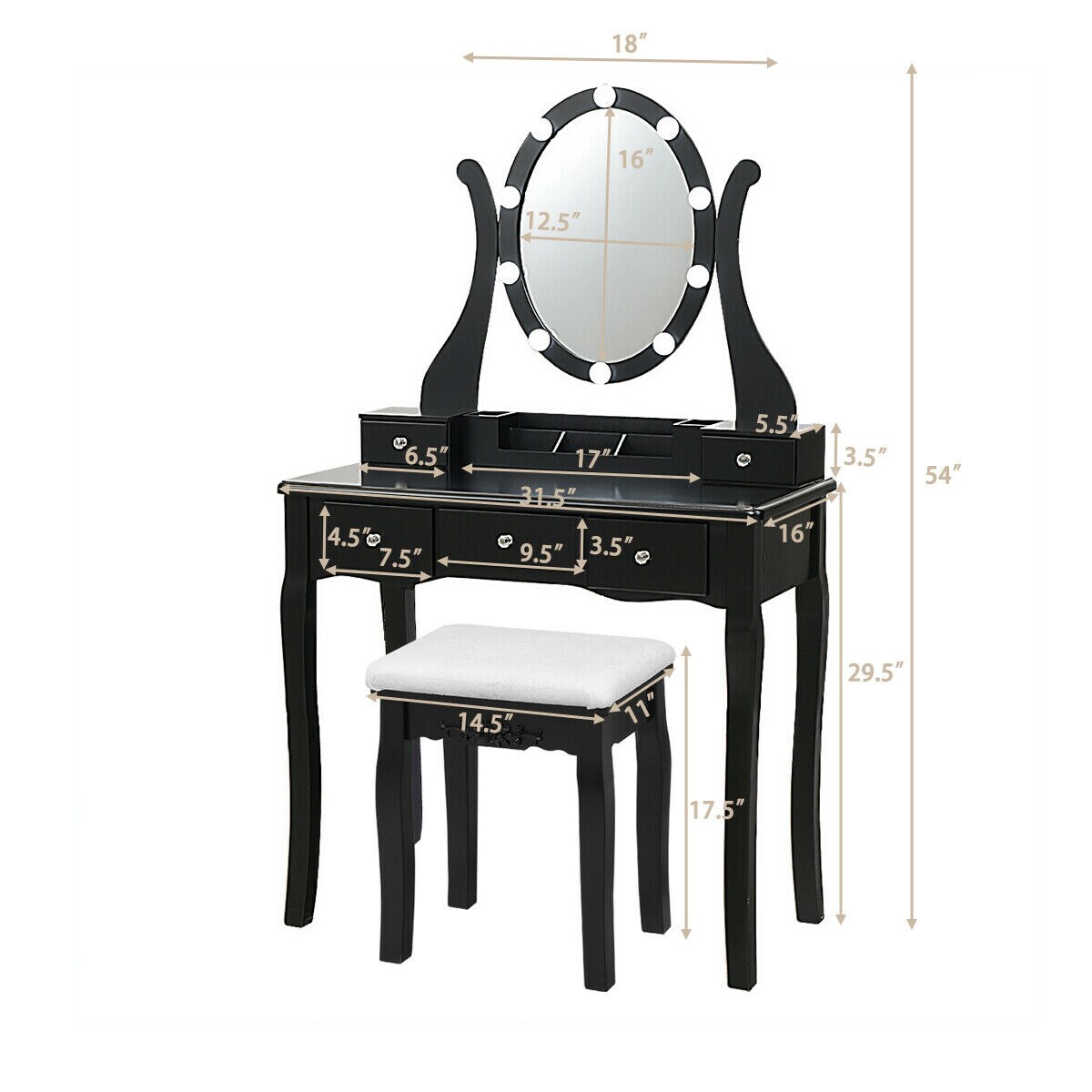Costway Vanity Table Set w/10 Light Bulbs and Touch Switch Makeup Dressing Table