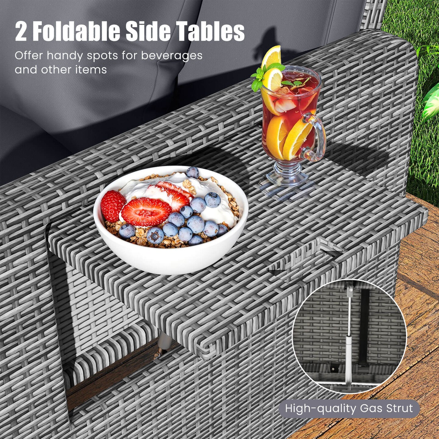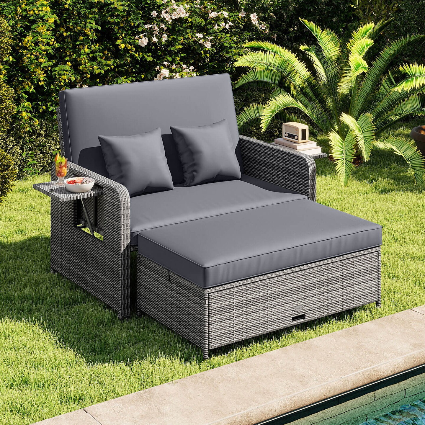 Costway Wicker Loveseat Sofa Set Patio Rattan Daybed with Ottoman & Retractable Side Tray