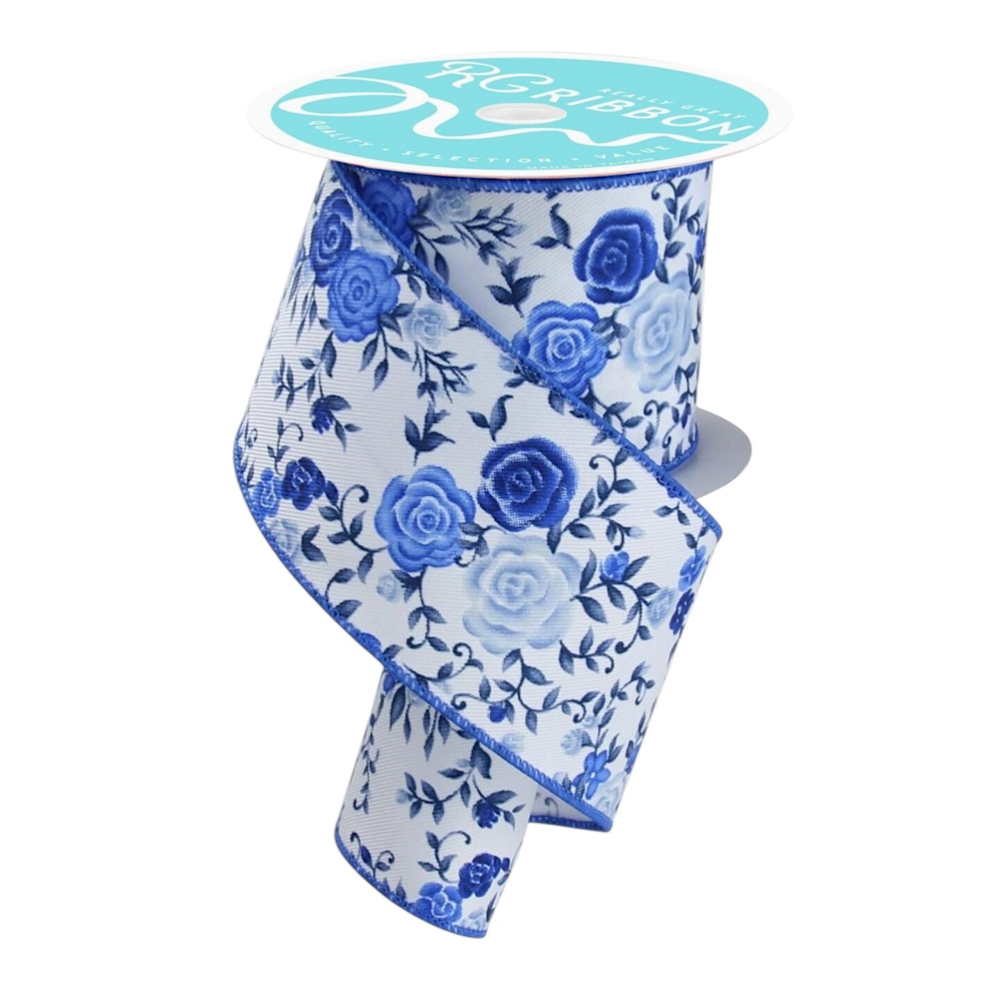 Cottage Roses Wired Ribbon 1.5" - 2.5" Inch by RG Ribbon - Blue, White