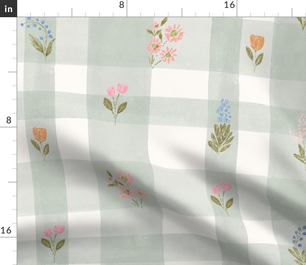 Cottagecore Floral Plaid Watercolor Sage Pastel Summer Spring Nursery Tulip Large Scale Cottage Coquette Boho Garden Flowers Modern Farmhouse Custom Printed Fabric by Spoonflower Various Fabrics by the Yard or Fat Quarter