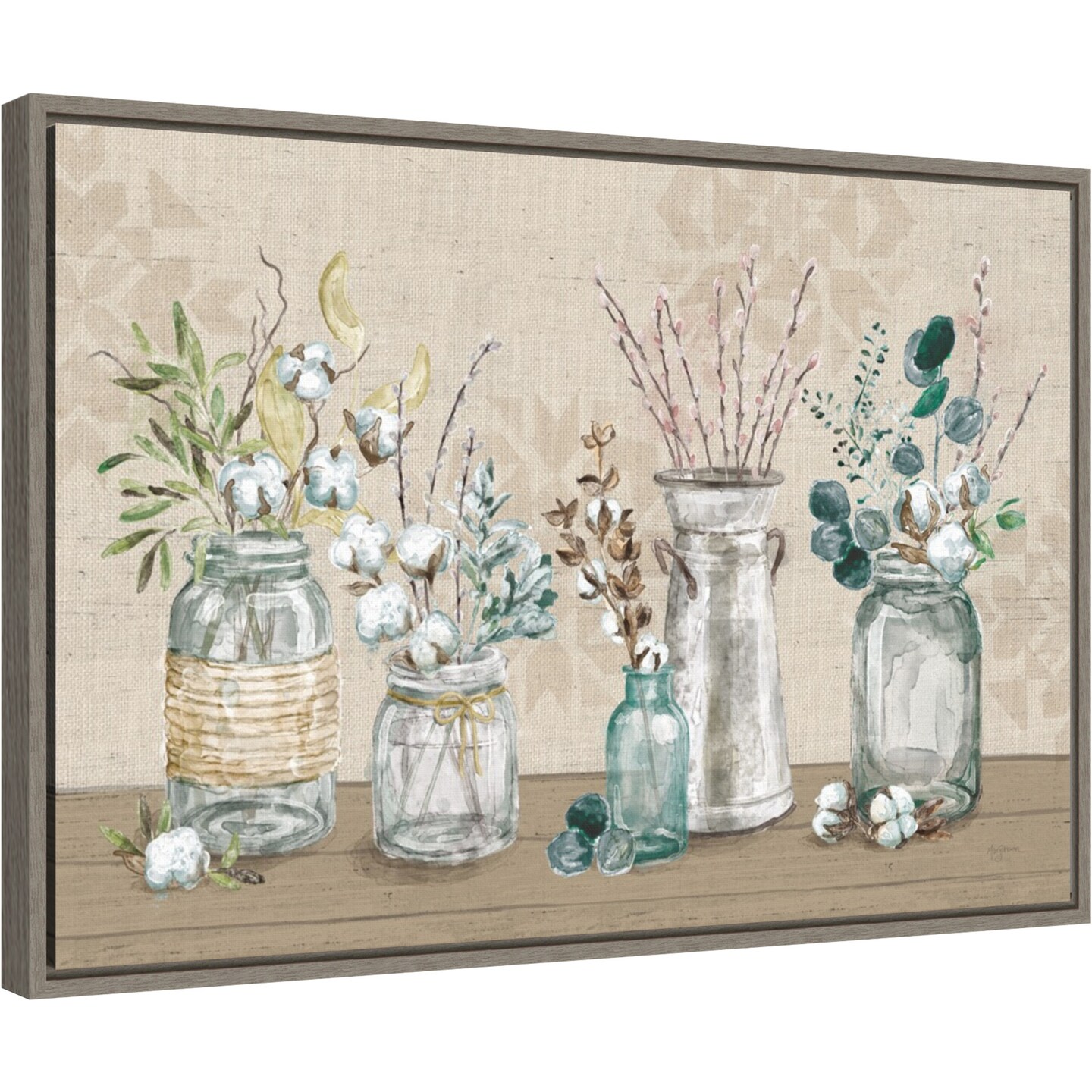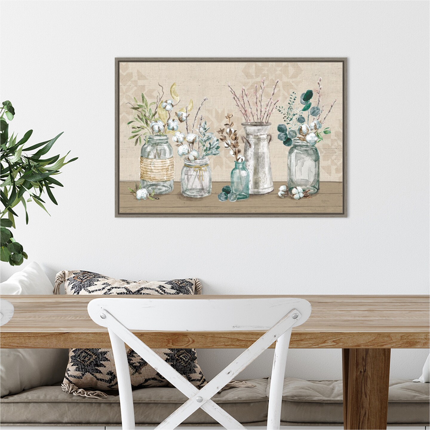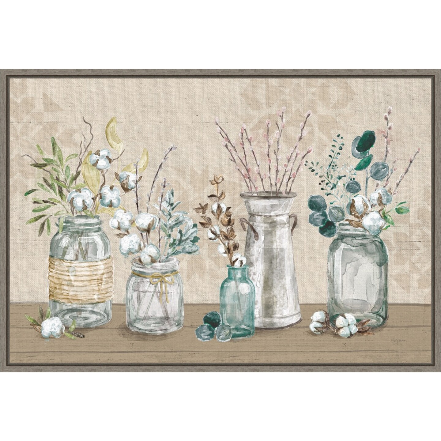 Cotton Bouquet in Vases I by Mary Urban 23-in. W x 16-in. H. Canvas Wall Art Print Framed in Grey
