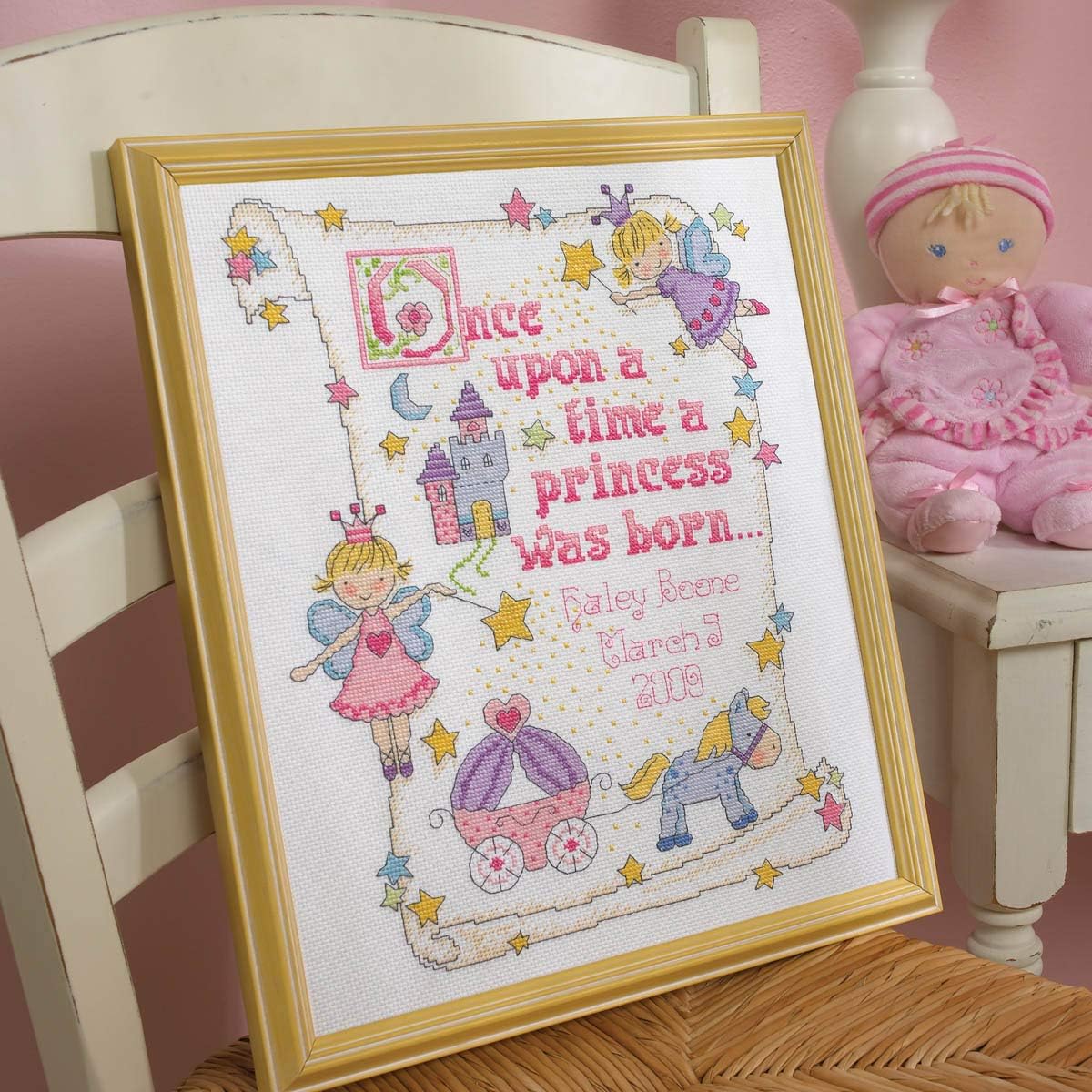 Counted Cross Stitch Birth Record Kit – 10×13 Inch “Princess” Pink Nursery Embroidery Set with Threads, Needle & Instructions
