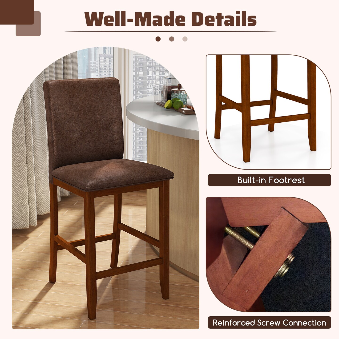 Counter Barstools with Rubber wood Legs and Padded Seats Set of 2