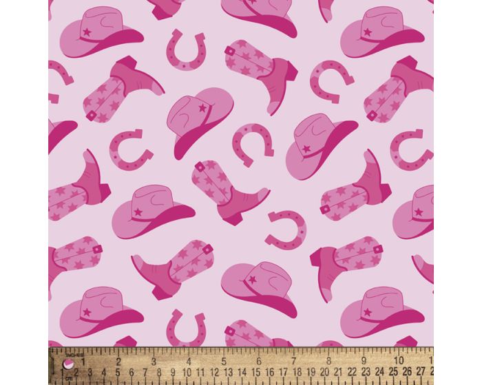 Cowgirls Hats, Boots and Horseshoes Pink Poly Cotton Fabric | By the Yard | Sewing and Crafting | 44 inches wide