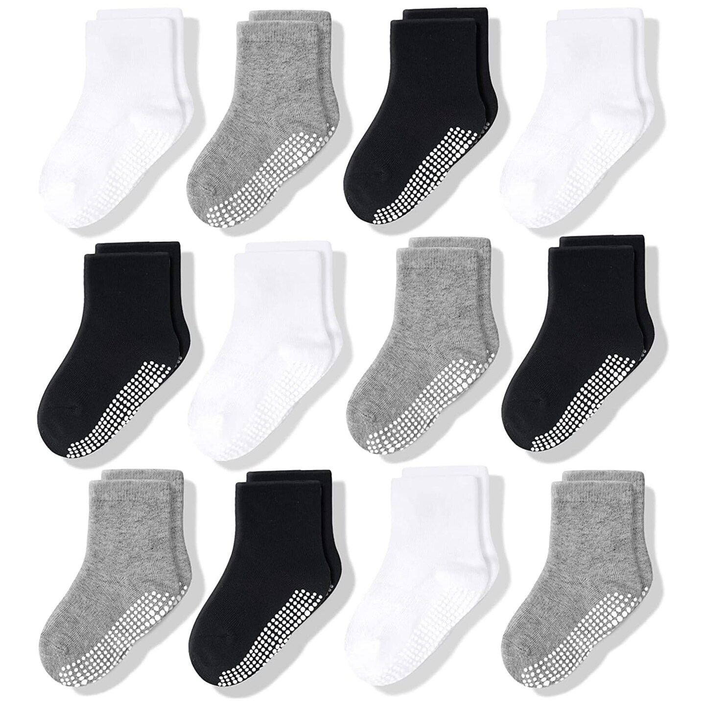 CozyWay Non-Slip Crew Grip Toddler Socks, 12 Pack for Boys & Girls, Black/White/Gray, 3-5 Years Old